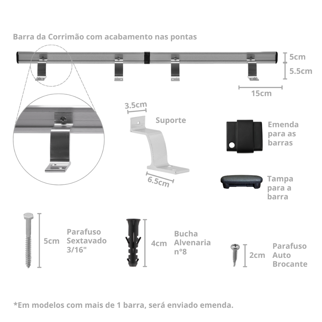 ****Produto À Pronta Entrega**** Comprando até as 10:00 horas Enviamos No Mesmo Dia !!!!!!!!!!!!!!!! - Produto Com Nota Fiscal + Garantia Experimente o corrimão de parede em Alumínio chato e descubra a combinação perfeita de segurança e elegância para o seu espaço. Com seu design moderno e robusto, este produto oferece proteção confiável sem comprometer a estética do ambiente. Sua fácil instalação torna a adição dessa barreira de segurança uma tarefa simples e rápida. Desfrute da tranquilidade de saber que você está protegido, sem abrir mão do estilo. Adquira o nosso corrimão em Alumínio hoje mesmo e dê um toque de sofisticação ao seu espaço, com segurança e facilidade. Itens Incluso No Kit: *Para Instalação do corrimão. - Medidas: 2,80 Metros (3x0,93 Metros ) - 3 Tubos Em Alumínio Chato. - 2 Emendas - 6 Suportes Em Alumínio. - 2 Tampas De Acabamento. - kit de Parafusos e Buchas Para Instalação: SIM - Padrão da NBR9050-2015: SIM - Peso suportado: Até 100Kg Por Metro Linear Obs. Produto Vai Desmontado, Fabricamos Sob Medida Temos Também Em Outras Cores Entre Em Contato Agora Mesmo Para Um Orçamento, Não Fazemos Instalação. Ainda com duvidas?. Utilize o CHAT PARA PERGUNTAS . Garantia do vendedor: 6 meses