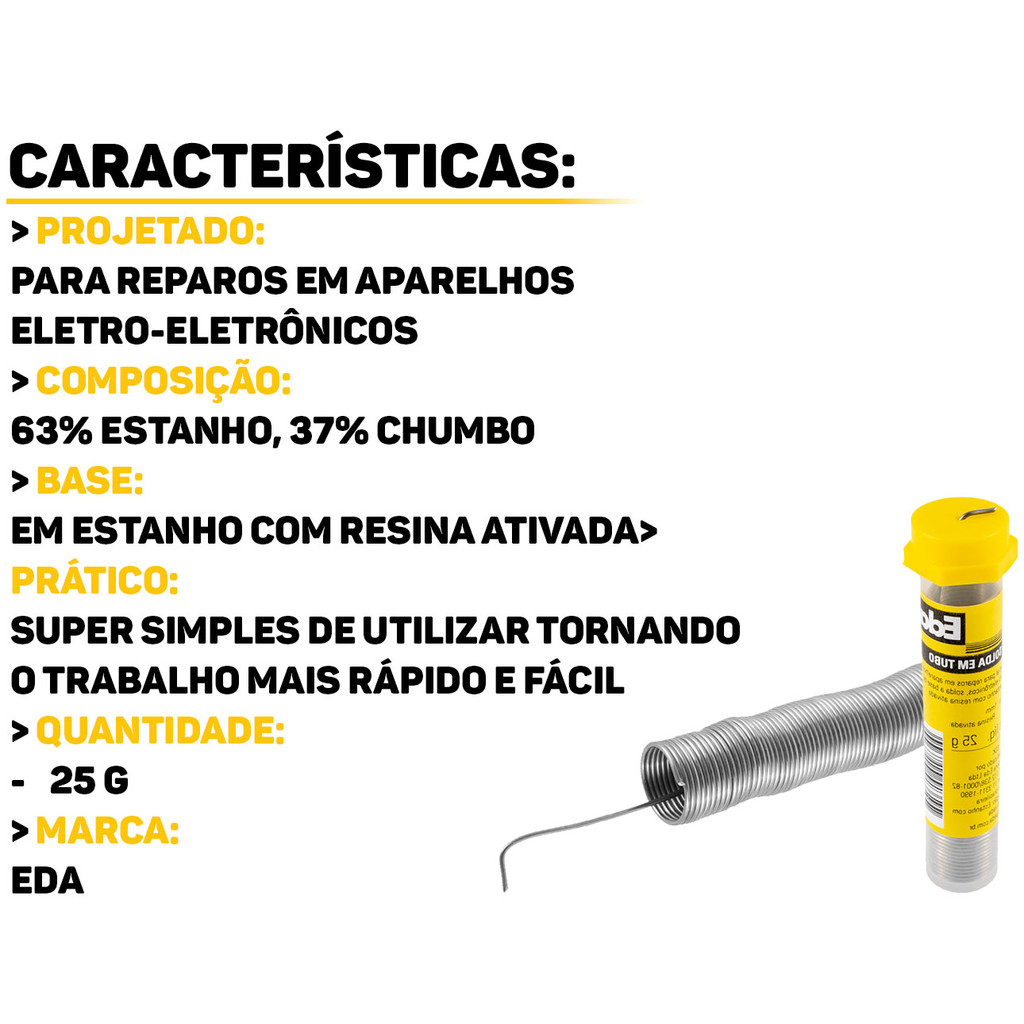 Solda Em Tubo 25g Eda A Solda em Tubo Eda é uma técnica utilizada para unir tubos metálicos com precisão, especialmente em sistemas que operam com altas frequências, como em equipamentos eletrônicos e de telecomunicações. Proporciona uma junção sólida e resistente, que pode suportar vibrações, altas temperaturas e condições adversas sem comprometer a integridade do tubo ou das conexões. Características: > Especial para reparos em aparelhos eletro-eletrônicos; > Em sistemas de alta frequência, as soldas ajudam a reduzir perdas de sinal e a interferência, melhorando a eficiência geral do sistema; > Pode ser usada em uma ampla gama de materiais metálicos, como cobre, alumínio e aço inoxidável, tornando-a versátil para diferentes tipos de aplicações. Especificações Técnicas: > Diâmetro da ponta: 1mm; > Material: base de estanho com resina ativada (63% estanho, 37% chumbo). - Marca: Eda - Garantia: 90 dias contra defeitos de fabricação Vantagens de comprar na Brester: - Produto a pronta entrega. - Produto novo, com garantia de fábrica. - Nota fiscal para Pessoa Física e Pessoa Jurídica.