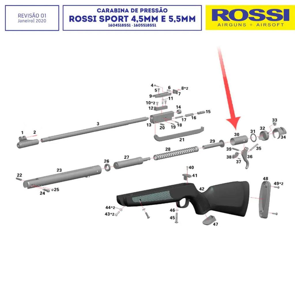 Sabendo o quanto as peças de reposição são itens importantes para quem compra qualquer tipo de equipamento, nós da AR15 SPORT disponibilizamos uma incrível variedade dessas peças em todo segmento de Tiro Esportivo, temos a linha mais completa do mercado em se tratando de peças para Carabinas de Pressão. Esse é um produto original ROSSI e se trata do TUBO TRASEIRO SUPORTE DO GATILHO compatível especificamente com a Carabina de Pressão Rossi Sport, Dione Black, New Black e Army. ESPECIFICAÇÕES TÉCNICAS: - Marca: Rossi - Material: Metal - Número 30 na vista explodida - Diâmetro x comprimento: 2,5cm x 5,3cm - Peso total: 41 gramas ITENS INCLUSOS: - 01 Tubo Traseiro Suporte Gatilho Carabina Rossi Sport, Dione Black, New Black e Army Observação: Garantia de 03 meses mediante defeitos de fábrica.
