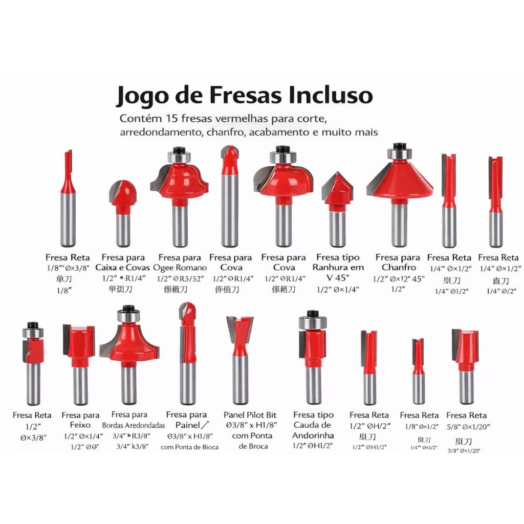 ⚠️ ATENÇÃO: ESTE ANÚNCIO POSSUI VARIAÇÕES! 🔧 TODAS AS OPÇÕES ACOMPANHAM O KIT DE FRESAS (15 PEÇAS) Escolha o modelo desejado antes da compra! TUPIA LAMINADORA 650W – MODELO MAIS POTENTE + KIT DE FRESAS 12 PEÇAS A Tupia Laminadora 650W é para quem precisa de ainda mais força e durabilidade! 💥 Excelente para trabalhos mais pesados, madeira dura e uso contínuo. Compacta, ergonômica e com ajuste preciso de profundidade. 🔹 Diferenciais da Tupia 650W ⚡ 650W de potência 💨 30.000 RPM 🔌 Voltagem: 110V ➕ Capacidade de corte até 6 mm 🧊 Sistema de refrigeração 🛠️ Estrutura robusta 🎯 Base transparente 📦 Acompanha: 1 Tupia Laminadora 650W 1 Guia de bordas 1 Adaptador para aspirador de pó 1 Conjunto de chaves 1 Manual + Kit de Fresas 6mm – 15 peças KIT DE FRESAS 6MM – 15 PEÇAS (INCLUSO EM TODAS AS OPÇÕES) 🪚 Conjunto com 15 fresas variadas TUPIA LAMINADORA 900W COM JOGO DE 15 FRESAS – Precisão, Potência e Acabamento Profissional A Tupia Laminadora ALLMIND é a ferramenta ideal para quem busca alto desempenho, precisão e versatilidade em trabalhos de marcenaria, carpintaria, móveis planejados e acabamentos em madeira. Indicada tanto para uso profissional quanto doméstico, oferece excelente controle e qualidade nos cortes, rebaixos, encaixes e bordas decorativas. Equipada com motor potente, a tupia possui rotação variável, permitindo ajustar a velocidade de acordo com o tipo de material e fresa utilizada. Sua rotação mínima é de aproximadamente 10.000 RPM e a máxima pode chegar a 30.000 RPM, garantindo cortes limpos e precisos em diferentes aplicações. O ajuste de profundidade é simples e preciso, com batente de profundidade ajustável, permitindo alcançar uma profundidade máxima de corte de até 25 mm. A base transparente facilita a visualização da área de trabalho, proporcionando maior precisão e segurança durante o uso. O kit acompanha um completo jogo com 15 fresas em aço de alta resistência, ampliando as possibilidades de uso para cortes retos, chanfros, arredondamentos, rasgos, rebaixos e acabamentos decorativos. Seu design compacto e ergonômico oferece conforto e firmeza no manuseio, reduzindo a fadiga em usos prolongados. Robusta, prática e eficiente, a tupia laminadora é indicada para trabalhos em madeira, MDF, compensado e materiais similares, entregando acabamento profissional com excelente custo-benefício. Especificações Técnicas Voltagem: conforme compra Frequência: 60Hz Velocidade mínima de rotação: aproximadamente 10.000 RPM Velocidade máxima de rotação: até 30.000 RPM Profundidade máxima de corte: até 25 mm Batente de profundidade: 1 ajustável Diâmetro da pinça (mandril): 6 mm Base: transparente Indicação de uso: madeira, MDF e compensados Dimensões Aproximadas Comprimento: 23 cm Altura: 20 cm Largura: 9 cm Peso: aproximadamente 1,5 kg Conteúdo da Embalagem 1 Tupia Laminadora 1 Jogo com 15 fresas 1 Guia lateral 1 Chave de ajuste 1 Conjunto de acessórios 1 Manual do usuário
