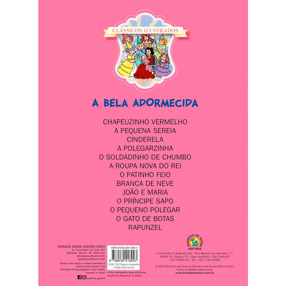 Livro Turma da Mônica | A Bela Adormecida Clássicos IlustradosMaurício de SousaReviva a magia do clássico conto de fadas com o charme da Turma da Mônica! Nesta adaptação encantadora, Mônica vive a Bela Adormecida, uma princesa amaldiçoada a dormir por cem anos. Cabe ao destemido príncipe Cebolinha enfrentar a cerca de espinhos e despertá-la com um gesto de heroísmo. Com ilustrações vibrantes e uma narrativa cheia de graça, este livro é a porta de entrada perfeita para os contos clássicos. Ele mantém a essência da fábula original enquanto encanta os pequenos leitores com o humor e o carisma dos personagens mais queridos do Brasil. O que você vai encontrar neste livro: Uma adaptação divertida e fiel do clássico A Bela Adormecida.Ilustrações coloridas com a Turma da Mônica nos papéis principais.Narrativa que combina fantasia, aventura e humor característico.Este livro é ideal para: Crianças que amam contos de fadas e a Turma da Mônica.Introdução aos clássicos da literatura infantil de forma lúdica.Leitura em família, com momentos de diversão e imaginação compartilhada.Adquira já Turma da Mônica: A Bela Adormecida e embarque nesta aventura encantada, onde a magia dos clássicos ganha vida com a turma mais amada do Brasil. Especificações do livro Turma da Mônica | A Bela Adormecida:Título:Turma da Mônica | A Bela AdormecidaSubtítulo:Clássicos IlustradosAutor(es):Maurício de SousaAno de Edição:2016Capa:BrochuraPáginas:16Dimensões:26,5 x 19,5 x 0,4 cmPeso:0,090 gISBN:9788539418923Editora:Girassol