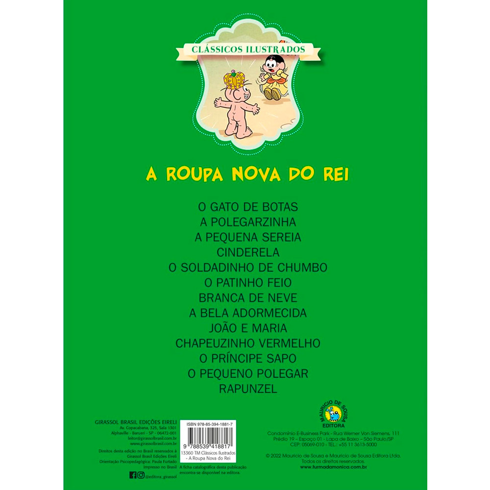 Livro Turma da Mônica | A Roupa Nova do Rei Clássicos IlustradosMaurício de SousaDivirta-se com esta hilariante e inteligente adaptação do clássico conto de fadas! Nesta versão da Turma da Mônica, Cebolinha vive um rei extremamente vaidoso que é enganado por dois espertalhões. Eles prometem tecer uma roupa invisível, que só pode ser vista pelos mais sábios, levando a situações engraçadas e reveladoras. Com ilustrações vibrantes e o humor característico da turma, esta história diverte enquanto aborda temas como vaidade, honestidade e a coragem de falar a verdade. Uma narrativa leve e perspicaz, perfeita para fazer refletir e rir ao mesmo tempo. O que você vai encontrar neste livro: Uma adaptação engraçada e fiel do clássico A Roupa Nova do Rei.Ilustrações coloridas e expressivas com a Turma da Mônica.Narrativa que combina humor, crítica social e lições sobre honestidade.Este livro é ideal para: Crianças que adoram histórias engraçadas e os personagens da Turma da Mônica.Trabalhar temas como vaidade, sinceridade e pensamento crítico de forma lúdica.Leitura em família, gerando conversas divertidas e reflexivas.Adquira já Turma da Mônica: A Roupa Nova do Rei e prepare-se para rir e refletir com esta fábula atemporal, contada com o jeito único da turma mais amada do Brasil.