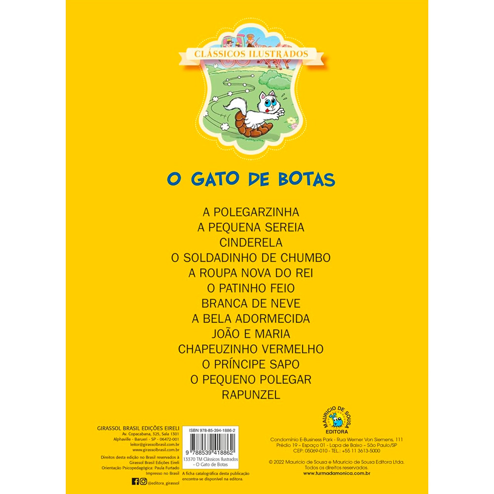 Livro Turma da Mônica | O Gato de Botas Maurício de SousaPrepare-se para uma aventura repleta de esperteza e diversão com a Turma da Mônica! Nesta adaptação encantadora, Chico Bento vive o jovem dono do astuto Gato de Botas, o Mingau, que usa sua inteligência e artimanhas para transformá-lo no rico e respeitado marquês de Carabás. Uma história que une o charme da roça à magia dos contos clássicos. Com ilustrações vibrantes e o humor característico da turma, este livro celebra a criatividade, a lealdade e o poder de uma boa estratégia. É uma narrativa cativante que diverte enquanto ensina valiosas lições sobre confiança e engenhosidade. O que você vai encontrar neste livro: Uma adaptação fiel e divertida do clássico O Gato de Botas.Ilustrações coloridas e expressivas com a Turma da Mônica.Narrativa que combina fantasia, humor e lições sobre astúcia e lealdade.Este livro é ideal para: Crianças que adoram contos clássicos e os personagens da Turma da Mônica.Trabalhar temas como criatividade, estratégia e confiança de forma lúdica.Leitura em família, proporcionando momentos de diversão e aprendizado compartilhado.Adquira já Turma da Mônica: O Gato de Botas e embarque nesta aventura inteligente e cheia de reviravoltas, onde um gato esperto prova que a astúcia vale mais do que a força. Especificações do livro Turma da Mônica | O Gato de Botas:Título:Turma da Mônica | O Gato de BotasAutor(es):Maurício de SousaAno de Edição:2016Capa:BrochuraPáginas:16Dimensões:26,5 x 19,5 x 0,4 cmPeso:0,090 gISBN:9788539418862Editora:Girassol