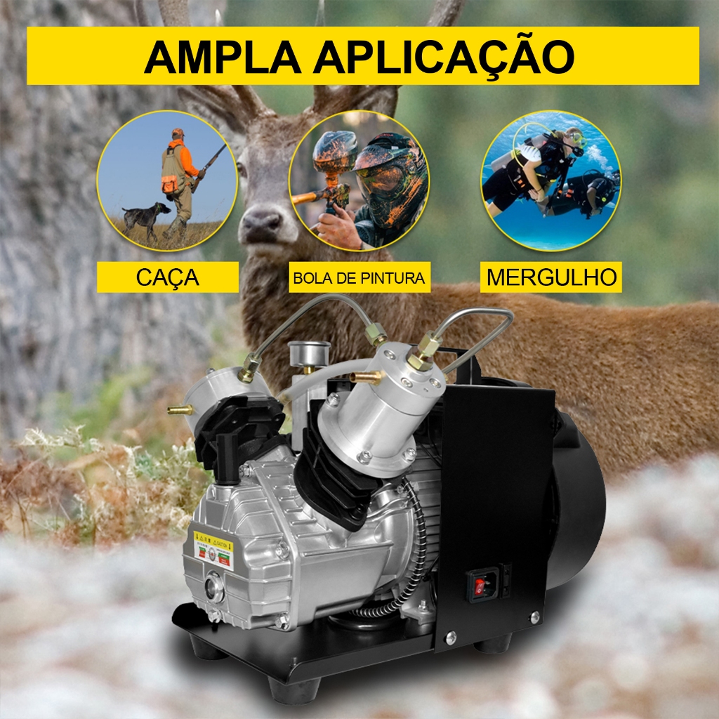 Especificação: Tensão: 220V, frequência: 50Hz, potência: 2,2kw, fluxo: 50L / min, pressão de trabalho: 30MPA / 300bar / 4500psi, Adequado para enchimento de garrafas com grande capacidade, leva cerca de 3 minutos para encher 0,5 litros de Barra de 0-300 litros e leva cerca de 45 minutos para encher 6,8 litros de 0-300 bar; Cilindro de compressão de dois estágios: Projetado com compressão de dois estágios para garantir um desempenho estável, adequado para pneus de carro, pneus de bicicleta, riflores de ar PCP pneumáticos soprados, tanques de paintball, equipamentos de arma de ar ou mergulho / cilindros de mergulho; Desligamento Manual: resposta sensível e precisa, leituras fáceis de entender, exibição correta do valor da pressão do ar do compressor de ar, desligamento Manual: resposta sensível e precisas, leituras fáceis de entender, exibição correta do valor da pressão do ar do compressor de ar, fácil de controlar e ajustar o valor da pressão necessário para diferentes trabalhos; Excelente sistema de resfriamento de água e ventilador: Um termômetro digital alimentado por bateria monitora um sistema de resfriamento de água independente. Você precisa preparar a água de resfriamento em um balde externo. Não inicie a máquina sem preparar a água de resfriamento. Antes de usar o compressor, substitua o respirador de óleo e cubra com óleo; Ampla aplicação:Perfeito para combate a incêndios, paintball, teste de vazamento, automóveis, teste de impermeabilidade do ar, perfeito para combate a incêndios, paintball, detecção de vazamento, teste de pressão, automóveis, teste de impermeabilidade do ar, teste à prova de pressão, etc.