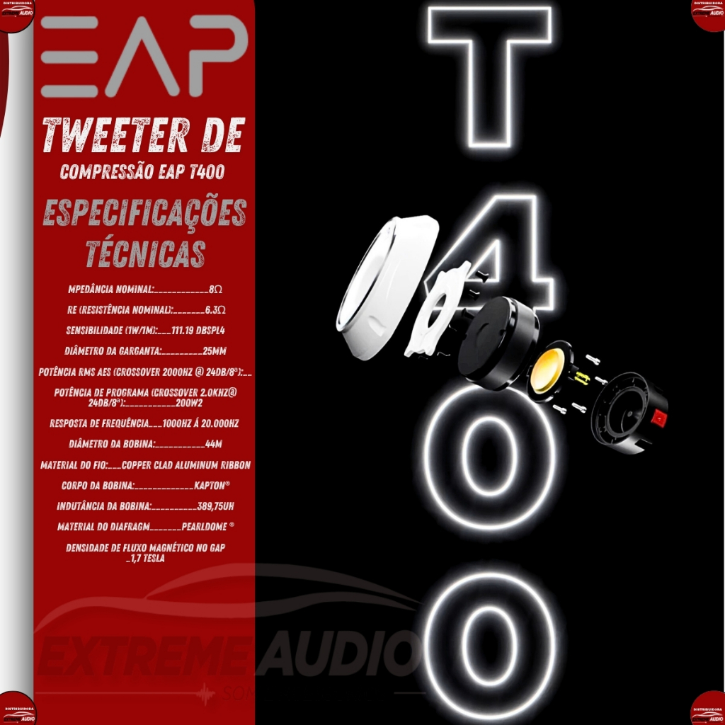 Especialmente desenvolvido para reprodução de altas frequências, o Tweeter EAP T400 é um Tweeter de compressão indicado para a utilização em sistemas de áudio que exigem alta qualidade, melhor sonoridade e maior resistência. Com o exclusivo diafragma de domo em Poliimida Perolizada PearlDome ®, lhe propicia alta sensibilidade, baixa distorção e alta confiabilidade, garantindo timbres perfeitos. Seu poderoso conjunto magnético foi projetado com software FEM (Finite Element Method) para obter 17.000 Gauss (1.7T). Usinado com altíssima precisão, garante qualidade e confiabilidade. Sua bobina móvel é fabricada com fio CCAR (Copper Clad Aluminum Ribbon), enrolada em forma de Kapton ®, obtendo-se grande estabilidade e resistência térmica. Acabamento com pintura KTL (eletrodeposição catódica) 8,45 garantindo excelente proteção anticorrosiva, sendo um processo eficiente que proporciona uma resistência superior a 1.000 horas em testes salt spray. ESPECIFICAÇÕES TÉCNICAS Impedância Nominal:_____________________________________________8Ω RE (Resistência Nominal):________________________________________6.3Ω Sensibilidade (1W/1m):__________________________________111.19 dBSPL4 Diâmetro da Garganta:________________________________________25mm Potência RMS AES (Crossover 2000Hz @ 24db/8ª):______________100W2 Potência de Programa (Crossover 2.0Khz@ 24db/8ª):___________200W2 Resposta de Frequência:_________________________1000Hz á 20.000Hz Diâmetro da Bobina:__________________________________________44mm Material do fio:________________________Copper Clad Aluminum Ribbon Corpo da Bobina:____________________________________________Kapton® Indutância da Bobina:______________________________________389,75uH Material do Diafragma:__________________________________PearlDome ® Densidade de fluxo Magnético no GAP:_______________________1,7 Tesla INFORMAÇÕES ADICIONAIS Material do imã: Ferrite de Bário Diâmetro x Altura do imã: 90mm x 20mm Profundidade: 95.00mm Polaridade: Tensão + no borne vermelho: eslocamento do diafragma na direção inversa da garganta. Peso Liquido: 1.600 Kg Peso Bruto com embalagem: 1.680kg Furos para Fixação: Padrão Furos Dimensões da Embalagem: 14cm x 14cm x 10cm Conteúdo da Embalagem: 1 x Tweeter EAP T400-8