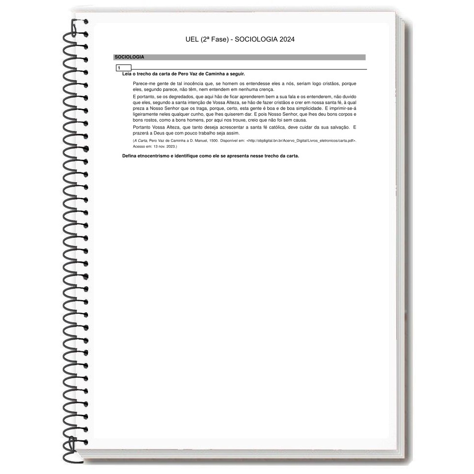 UEL | 2ª FASE - Provas Anteriores ** Discursivas: Específicas ** Artes (ART) / Biologia (BIO) / Espanhol (ESP) / Filosofia (FIL) / Física (FIS) / Geografia (GEO) / História (HIS) / Inglês (ING) / Matemática (MAT) / Português (POR) / Química (QUI) / Sociologia (SOC) [[ ANOS ]] 2012 / 2013 / 2014 / 2015 / 2016 / 2017 / 2018 / 2019 / 2020 / 2021 (redação) / 2022 (redação) / 2023 / 2024 / 2025 / 2026 * obs.: não houve prova específica em 2021 e 2022 * obs.: não houve prova específica de Espanhol, Geografia e Inglês em 2026 * obs.: não possui as provas objetivas da 2ª fase * Respostas no final da apostila * Formato: Impressa ===== Opção de [[ TAMANHO REDUZIDO ]]: - 2 páginas por folha - folha na horizontal (deitada) - menor preço!