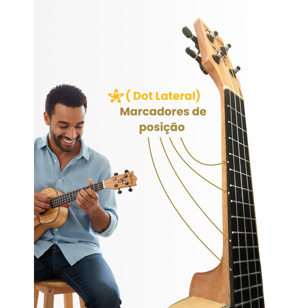Seu Hoku não é um ukulele básico! Ele possui upgrades essenciais para um som superior e maior conforto: Madeira Principal (Corpo): Ash (Freixo) – Madeira nobre que proporciona um timbre mais cristalino, leve e equilibrado. Cavalete: Ébano – Madeira escura e densa, geralmente reservada para instrumentos premium, garantindo durabilidade e excelente transferência sonora. Pestana (Nut) e Rastilho (Saddle): Osso – Essencial para maximizar o sustain (a duração da nota) e a clareza do timbre, um grande diferencial em relação ao plástico comum. Tarraxas: Blindadas (Fechadas), Pretas – Oferecem maior precisão e estabilidade na afinação. Conforto: Possui Armrest (apoio de braço) integrado e design de cabeçote (Tróculo / High Heel) Curvado para máximo conforto ao tocar. Marca: Mahina Linha: HOKU Tipo: Ukulele Acústico Tamanho: (Concert) Orientação: Destro Cor / Acabamento: Natural (Madeira Clara) / Verniz Acetinado Cordas: 4 Cordas Aquila (Instaladas de Fábrica) Número de Trastes: 18 DESTAQUE DO SOM E DESIGN Timbre: Cristalino, leve e perfeitamente equilibrado, ideal para gravações ou performances. Design: Estética natural com acabamento acetinado elegante e design Curvado no cabeçote. CONDIÇÃO Estojo / Bag: Não incluso. Ideal para: Músicos iniciantes e intermediários que buscam um instrumento de estética apurada e qualidade sonora de nível superior.