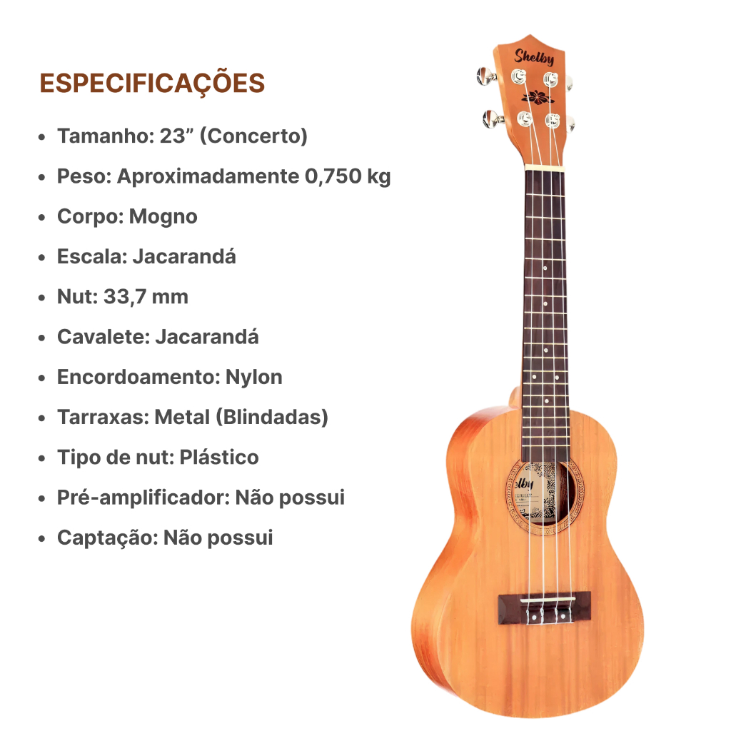 Ukulele Shelby Concert Eletrico com captacao passiva - Capa - Cabo 5 METROS - Afinador - 3 Palhetas. Produto novo, vai embalado com nota fiscal e garantia de 90 dias. Somos a Eletromusic Loja Especializada a mais de 10 anos no Mercado. Qual e o nosso diferencial? Buscamos sempre oferecer qualidade com excelencia por isso todos os nossos produtos sao de Fornecedores Nacionais com rigoroso controle de qualidade, possuem nota fiscal eletronica e garantia de fabrica. Voce e bem vindo para fazer parte da nossa historia. Descricao: O ukulele e um instrumento de cordas, semelhante ao violao, mas com dimensao reduzida. Com quatro cordas, normalmente afinadas em la, mi, do e sol. Os ukuleles Shelby destacam-se pela excelente relacao custo/beneficio, sendo um otima opcao para os amantes deste instrumento. Marca: Shelby (Eagle) Modelo: SU-23 STNT Linha: Acustico Estilo: Concerto Tamanho: Adulto ESPECIFICACOES . Tampo: Mogno . Lateral:MOgno . Fundo: Mogno . Escala: Jacaranda (Rosewood ) Cavalete: jacaranda ( Rosewood ) . Tarraxas: 2+2 Niqueladas . Trastes: 15 em Latao . Marcacao: Bolinhas Brancas . Roseta: Mosaico . Escudo: Nao Possui . Braco sem Tensor Regulavel . Corpo sem Cutaway . Tipo de Captacao: Passiva . Saidas: Plug P10 . Cordas: Nylon . Cor: Satin Natural (STNT) . Acabamento: Acetinado (fosco) MEDIDAS Comprimento: 62 cm Largura: 21 cm Espessura: 7 cm Tamanho da Escala: 26 cm Conteudo da Embalagem: