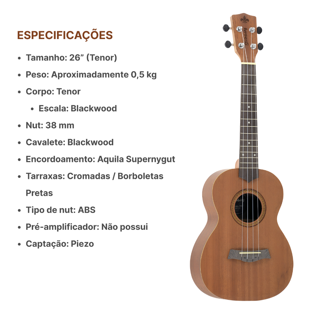 ACOMPANHA O KIT: 1) UKULELE STRINBERG UK06T 2) CAPA REFORÇADA 3) SUPORTE SH85 4) AFINADOR ST01 5) 3 PALHETAS O Ukulele Tenor Strinberg é caracterizado por uma ótima sonoridade, boa tocabilidade e um belíssimo acabamento. É ideal para quem está à procura de um novo Ukulele ou para quem quer começar a tocar um instrumento. É um produto de alta qualidade que a Strinberg pode oferecer! Desde a seleção dos materiais até sua fabricação final, proporciona um acabamento capaz de satisfazer qualquer pessoa! Com este Ukulele, você terá um companheiro para compartilhar suas músicas favoritas e ele ainda vem com uma bag para ser transportado com segurança para onde você quiser. A Strinberg iniciou seu legado na década de 90 com o objetivo de projetar uma linha de instrumentos de cordas com estilo original. Desde então, ela oferece uma ampla gama de produtos que vão desde violões, guitarras, baixos, encordoamentos, acessórios e muito mais. Seus produtos são fabricados com os mais altos padrões de qualidade e as mais modernas técnicas. Portanto, se você está à procura de instrumentos musicais de alto padrão, a Strinberg é uma ótima opção. Marca: Strinberg Acabamento: Fosco Tampo: Laminado Madeira: Mahogany Lateral e Fundo: Laminado Madeira: Mahogany Roseta: Madeira Braço: Nato Escala: Blackwood Trastes: 14 Nut (Pestana): 38 mm Material do Nut: Plástico Cavalete: Blackwood Tarraxas: Cromadas Com Borboletas Pretas