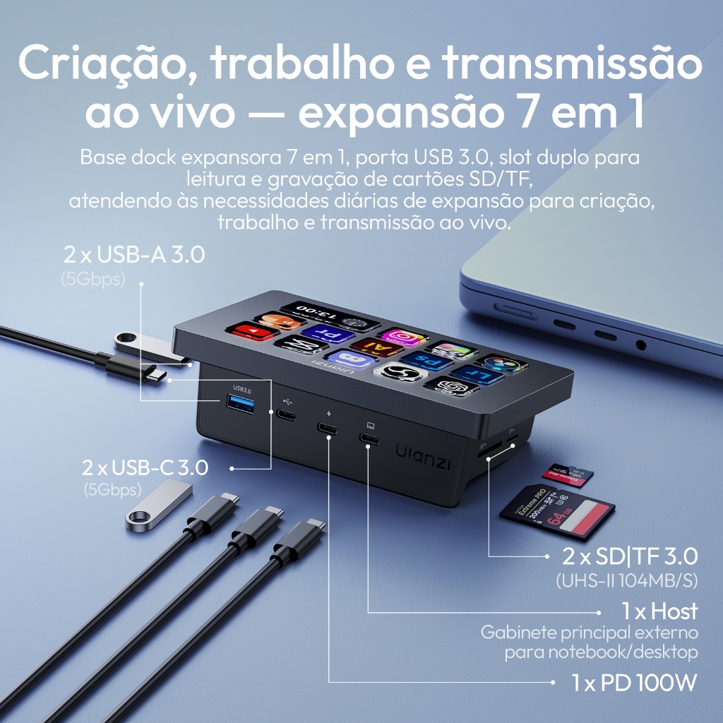 Preset simplificado, controle suave: embalado com predefinições versáteis e plug-ins, o deck permite que você execute tarefas complexas com um único toque. Sem curva de aprendizado íngreme, basta conectar e assumir o controle total. Criação de conteúdo --- abra menus instantaneamente, selecione ferramentas, combine camadas, escolha faixas e importe arquivos — tornando a foto, o vídeo e a arte sem esforço. Suporta Ps, Pr, Ae, DaVinci Resolve e CapCut; Office Assistant --- funciona com ChatGPT, Deepseek, Excel e mais aplicativos de escritório. Um toque para iniciar aplicativos, iniciar chamadas, compartilhar telas, alternar janelas e abrir arquivos; controle de transmissão --- um toque para começar a transmitir, mudar cenas, enviar predefinições e controlar luzes e som para um show solo envolvente. Embalado com uma estação de ancoragem 7 em 1, leitores de cartão SD/TF ultrarrápidos e carregamento rápido PD de 100 W, a base Ulanzi Deck é a melhor multitarefa. Conecte, ligue e transfira em um piscar de olhos — tudo a partir de um hub elegante! 2 portas USB-C 3.0 (5 Gbps); 2 USB-A 3.0 (5 Gbps); 1 PD 100W; 1 host; 2 SD|TF 3.0 (UHS-II 104 MB/S). Ilumine seu estúdio, à sua maneira: assuma o controle total de suas luzes Ulanzi K6500 e das lâmpadas Philips Hue com Lightmaster. Ajuste o brilho, a cor e os efeitos instantaneamente — defina o clima, aperfeiçoe sua foto e ilumine seu espaço como nunca antes! *Compatível com: Ulanzi K6500, VL-200Bi, VL-120C, VL-120Bi, EC65, AL60, AL120 e para Philips Hue (controle remoto Bluetooth necessário). Ulanzi Studio Marketplace: acesse facilmente uma rica coleção de aplicativos, predefinições, pacotes de ícones e softwares complementares. Baixe e use instantaneamente com atualizações regulares. *Sistema suportado: Windows Win 10 e posterior/MacOS 10.13 e posterior. O suporte D200H também está disponível na loja; os clientes que precisarem deste item podem entrar em contato com nossa equipe de atendimento ao cliente.