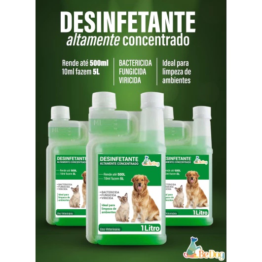 DESINFETANTE ALTAMENTE CONCENTRADO BE DOG BACTERICIDA FUNGICIDA VIRICIDA ELIMINA ODORES - FRAGRÂNCIA HERBAL - 1 LITRO Especificações: • Desinfetante concentrado BeDog é indicado como bactericida, fungicida e viricida e eliminador de odores com propriedade tensoativa biodegradável e não corrosiva, pode ser usado em clínicas veterinárias, hospitais veterinários, canis, gatis, na limpeza e desinfecção do piso, paredes salas de banho e tosa, mesas de atendimento e de cirurgia e instrumentos cirurgicos. Com alto poder de combate as bactérias. Modo de usar: • Para a correta desinfecção é recomendado a remoção de toda a sujeira, seguida de lavagem e enxague. Depois de limpo recomenda o uso do Desinfetante Concentrado BeDog. Para diluir o produto basta colocar 10ml em um balde com 5 litros de água e aplicar sobre a área desejada ou se preferir pulverizar. Fórmula: Cada 100ml contém: • Cloreto de benzalcônio......15,00g • Veículo q.s.p.............100,00ml