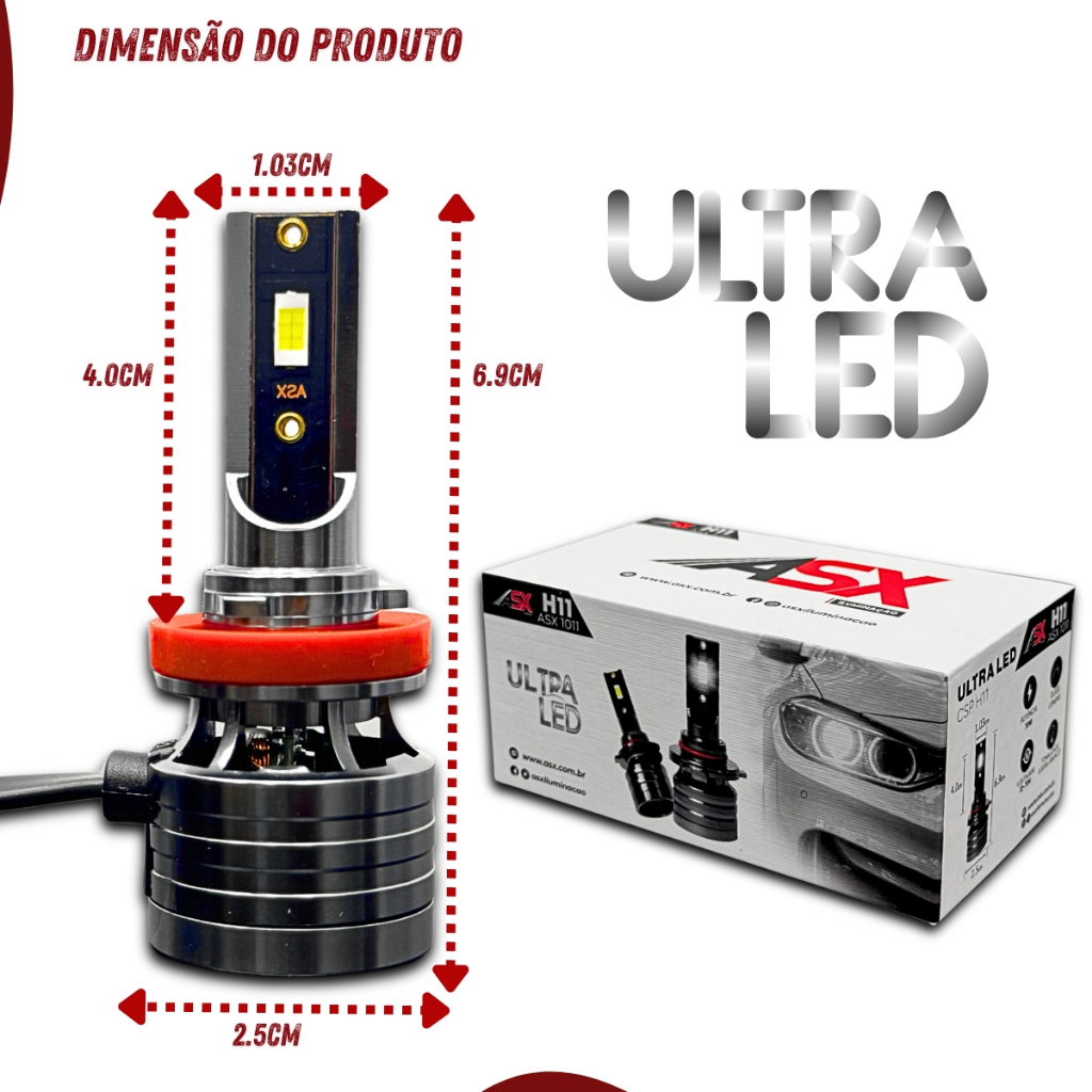 Ultra LED ASX Modelo H11/H8 CSP 70W 6000k 10000 Lumens 12/24V Com Cooler Além de proporcionar um estilo diferente para a moto, como também para o motorista, este kit de lâmpadas e extremamente eficiente e inovador no mercado atual, pois consegue oferecer a qualidade e tonalidade de 6000 kelvins utilizando a tecnologia ULTRA LED CSP, com maior eficiência de iluminação baixa geração de calor e melhor sistema de resfriamento. Este kit de lâmpadas possui tonalidade de 6000k, baixo consumo, pode ser utilizados em carro de 12/24 volts com garantia de vida útil prolongada. A tonalidade branca e eficiente para melhorar a visualização de placas e sinalizações, como também incrementa um efeito estético diferenciado. A instalação e extremamente simples, nao necessita de reator ou rele. Modelos Disponíveis: . H11/H8 70W. Tonalidade: . 6000K Especificação Técnica: . Marca: ASX . Tecnologia Japonesa: Ultra LED CSP . Sistema de dissipação: Dissipador e cooler . Modelos disponíveis: H11/H8 . 6000K (Kelvins) Extremamente Branca . Base de Lâmpada: Em Alumínio . Eficiência de Lm: 10000 Lumens . Vida Útil de: 30000 Horas . Ângulo de irritação: 360 graus . Efeito de Iluminação: 90 ~ 120lm / w . Temperatura de Trabalho: 40 ? C ~ 105 ? c . Consumo: 70W Cada . Proporciona Melhora na Visualização de Placas e Sinalizações . Economiza a Bateria . Voltagem: DC 9 ~32V . Voltagem Compatível com Carro Caminhão Ônibus e Maquinas . Cor de Temperatura : 6000~6500K Conteúdo da Embalagem: 01 Par Super ULTRA LED 8000 LUMENS H11/H8 70W. Importante: Garantia de 3 Meses. Valor do kit. A instalação deve ser feita por profissional especializado. Recomendamos que a instalação seja feita por profissional nao nos responsabilizamos por instalação mal realizada.