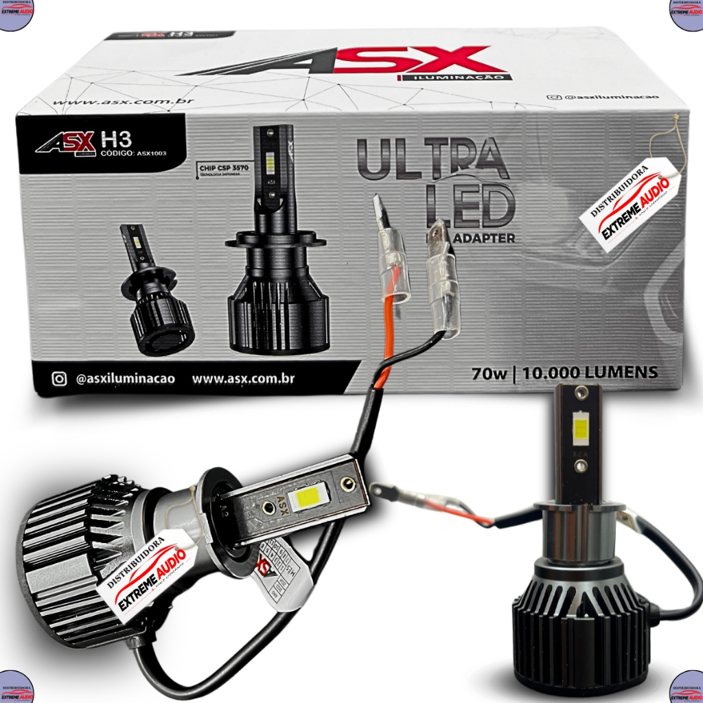 Ultra LED ASX Modelo H3 CSP 70W 6000k 10000 Lumens 12/24V Com Cooler Além de proporcionar um estilo diferente para a moto, como também para o motorista, este kit de lâmpadas e extremamente eficiente e inovador no mercado atual, pois consegue oferecer a qualidade e tonalidade de 6000 kelvins utilizando a tecnologia ULTRA LED CSP, com maior eficiência de iluminação baixa geração de calor e melhor sistema de resfriamento. Este kit de lâmpadas possui tonalidade de 6000k, baixo consumo, pode ser utilizados em carro de 12/24 volts com garantia de vida útil prolongada. A tonalidade branca e eficiente para melhorar a visualização de placas e sinalizações, como também incrementa um efeito estético diferenciado. A instalacao e extremamente simples, nao necessita de reator ou rele. Modelos Disponíveis: . H3 70W. Tonalidade: . 6000K Especificação Técnica: . Marca: ASX . Tecnologia Japonesa: Ultra LED CSP . Sistema de dissipação: Dissipador e cooler . Modelos disponíveis: H3 . 6000K (Kelvins) Extremamente Branca . Base de Lâmpada: Em Alumínio . Eficiência de Lm: 10000 Lumens . Vida Útil de: 30000 Horas . Ângulo de irritação: 360 graus . Efeito de Iluminação: 90 ~ 120lm / w . Temperatura de Trabalho: 40 ? C ~ 105 ? c . Consumo: 70W Cada . Proporciona Melhora na Visualização de Placas e Sinalizações . Economiza a Bateria . Voltagem: DC 9 ~32V . Voltagem Compatível com Carro Caminhão Ônibus e Maquinas . Cor de Temperatura : 6000~6500K Conteúdo da Embalagem: 01 Par Super ULTRA LED 10000 LUMENS H3 70W. Importante: Garantia de 3 Meses. Valor do kit. A instalacao deve ser feita por profissional especializado. Recomendamos que a instalacao seja feita por profissional nao nos responsabilizamos por instalacao mal realizada.