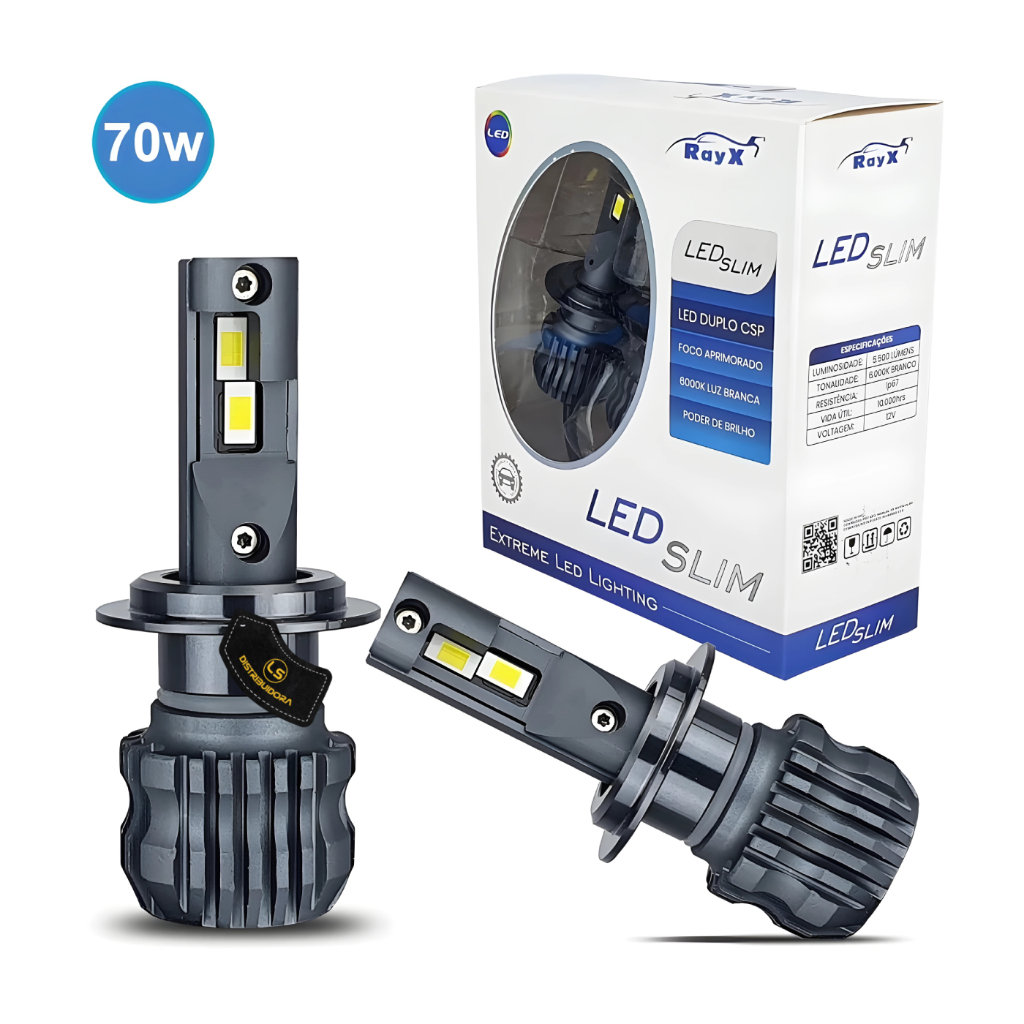 ULTRA LED SLIM (DUPLO CSP) 6000K | 70W | IP67 | 11.000 LUMENS O PAR! OBS: Escolha acima do botão comprar o modelo certo para o seu carro! • H1 | H3 | H7 | H8 | H11 | H16 | H27 | HB3 | HB4 -------------------------- CARACTERÍSTICAS -------------------------- • Tecnologia Duplo LED CSP • Foco Aprimorado • Fácil instalação • Corpo em alumínio • Durabilidade até 10.000 Horas • Slim • 6000k • Iluminação branca fria • Reator embutido • Aplicação: Farol alto e farol baixo. OBS: Verifique no manual do seu carro qual o modelo certo para cada posição do farol! ------------------------ ESPECIFICAÇÕES ------------------------ • Temperatura de cor: 6000K • Potência: 70W (35w por lâmpada) • Tensão: 12V • Fluxo luminoso: 5500 lumens/peça (11.000 o Par) • Liga de alumínio • Grau de proteção: IP 67 • Resistência: Vibrações e ao calor • Temperatura de Trabalho: -40° ~ +80°C • Dissipador de Calor: Alumínio ------------------------ ITENS INCLUSOS ------------------------ • 01 Par de Lampada RayX Slim