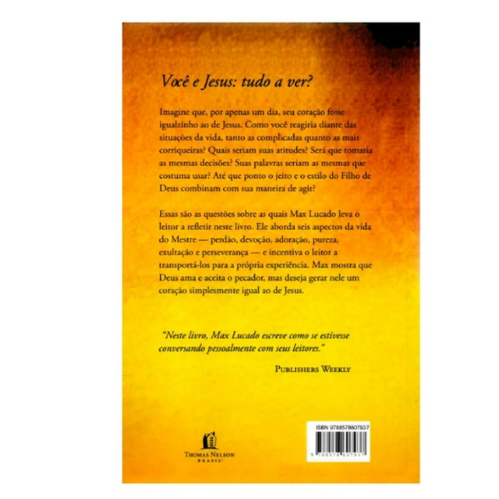 VOCÊ E JESUS: TUDO A VER?Imagine que, por apenas um dia, seu coração fosse igualzinho ao de Jesus. Como você reagiria diante das situações da vida, tanto as complicadas quanto as mais corriqueiras? Quais seriam suas atitudes? Será que tomaria as mesmas decisões? Suas palavras seriam as mesmas que costuma usar? Até que ponto o jeito e o estilo do Filho de Deus combinam com sua maneira de agir atual?Estas são as questões sobre as quais Max Lucado (o autor de Faça sua vida valer a pena, Sem medo de viver e muitos outros livros de sucesso) leva o leitor a refletir em Um coração igual ao de Jesus. Este livro mostra como o Salvador é capaz de transformar o nosso coração para torná-lo mais parecido com o dele. O resultado dessa mudança é surpreendente, pois as bênçãos decorrentes afetam não apenas a vida de quem se propõe a aceitar esse desafio, como também a de todos os que nos rodeiam."Neste livro Max Lucado escreve como se estivesse conversando pessoalmente com seus leitores." Medidas 14x21cm 87 Páginas