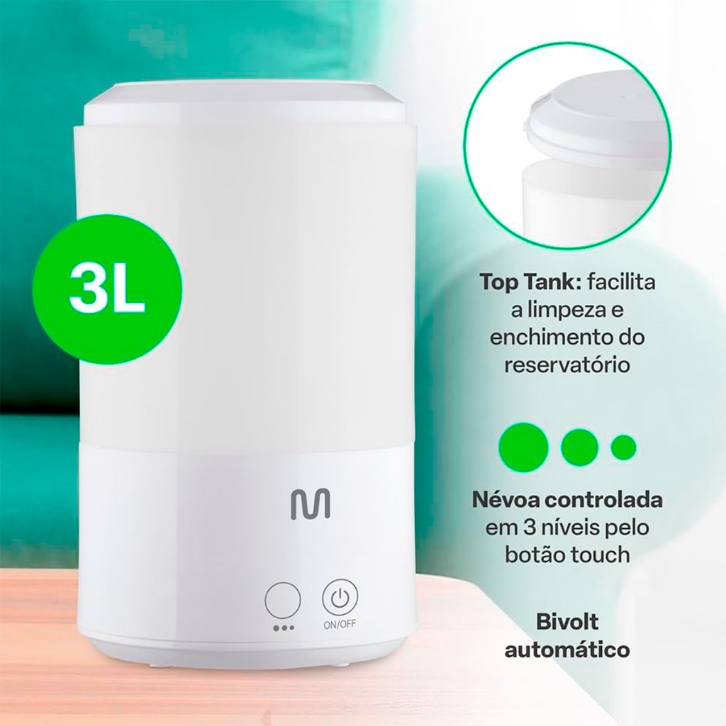 Distribuído por Ismafer Ferramentas - Umidificador de Ar Portatil Silencioso Pure Air - HC143 - Multilaser Saúde Descrição do produto: O Umidificador Pure Air é a escolha ideal para garantir ambientes mais saudáveis, produtivos e confortáveis, tanto de dia quanto à noite! Desenvolvido pela linha Multi Saúde, o Pure Air melhora a qualidade do ar que você e sua família respiram por meio da umidificação eficiente dos ambientes. Ele ajuda a hidratar as vias respiratórias, aliviando tosse, congestão nasal e desconfortos causados pelo tempo seco, ideal para crianças, adultos e idosos. Seu reservatório de 3 litros garante funcionamento contínuo por até 27 horas e, ao esvaziar, o aparelho desliga automaticamente para maior segurança. Conta com três níveis de controle de névoa, além de ser silencioso e compatível com óleos essenciais, oferecendo uma experiência ainda mais agradável e relaxante. Principais benefícios do Umidificador Pure Air: - Melhora a qualidade do ar e hidrata as vias respiratórias - Reduz sintomas de tosse, congestão nasal e alergias respiratórias - Funcionamento contínuo de 13 a 27 horas com reservatório de 3L - Desligamento automático ao esvaziar - 3 níveis de névoa ajustáveis - Compatível com óleos essenciais para aromaterapia Ficha Técnica: Marca: Multi Modelo: HC143 Cor: Branco Reservatório: 3 Litros Funcionamento: 13 a 27 hrs Funções do Aparelho: Umidificação do ambiente Peso: 720g Garantia: 12 meses SKU: 25033 Distribuído por Ismafer Ferramentas