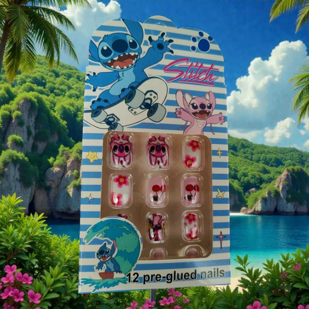 ANUNCIO DE VARIAÇAO ESCOLHA O MODELO UNHAS POSTIÇAS MODELO LILO STICH DECORADAS NA CAIXA ACOMPANHA 1 KIT DE ADESIVOS DUPLA FACE PARA COLAR AS UNHAS FACIL COLOCAÇAO UNHAS DECORADAS DE FACIL APLICAÇAO MODA DE MENINAS