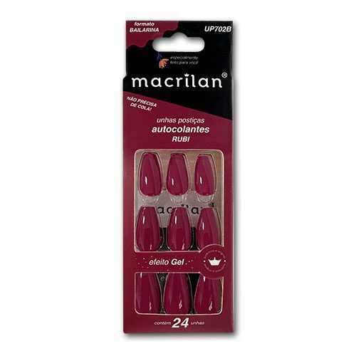 Unhas Postiças Macrilan, especialmente desenvolvidas em uma versão colorida, formato bailarina e com adesivo autocolante para uma aplicação rápida e segura. Indicadas para uso pessoal e profissional. O Kit também tem lenços umedecidos, mini lixa e palito que ajudam a preparar a unha para a aplicação e remoção. Comprar Modo de usar: Preparação das unhas naturais Com as mãos limpas utilize os lenços umedecidos para remover a oleosidade das unhas. Lixe o corpo da unha para retirar possíveis ondulações que dificultem a aderência, se necessário. Preparação das unhas postiças Macrilan Selecione os tamanhos que mais se aproximam de suas unhas naturais. Lixe as laterais e a borda até que adquiram o tamanho desejado, se necessário. Aplicação das unhas postiças Macrilan Remova a película que protege o adesivo. Fixe a unha postiça em sua unha natural e pressione por alguns segundos. Repita o mesmo processo em todas as unhas. Evite contato com água por, no mínimo, uma hora após a aplicação. Remoção das unhas Retire as unhas delicadamente, iniciando pelas laterais, com auxílio do palito. Remova as unhas uma a uma, sem forçá-las. Dicas importantes: Não é indicado colocar as unhas postiças no dia que retirou suas cutículas ou quando a unha estiver doente. É aconselhável que haja um intervalo entre a remoção e uma nova aplicação. Esses procedimentos visam manter a saúde de suas unhas naturais. Conteúdo: 24 unhas postiças com adesivo autocolantes, 2 lenços umedecidos, 1 lixa e 1 palito. Tamanho: Unhas: tamanho médio para unhas adultas. Lenços: 60x30mm. Lixa: 35x15mm. Palito: 50mm. Composição: Unhas: Plástico ABS, polietileno, politereftalato de etileno, adesivo acrílico. Lenços: Álcool etílico e água. Lixa: Papel, polipropileno e EVA. P