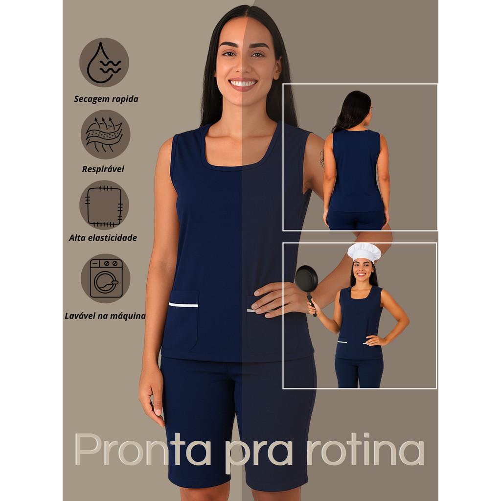 Você cuida de tudo. E merece um uniforme à altura. Nosso conjunto foi pensado para quem faz a diferença todos os dias, com dedicação, movimento e muito trabalho. Confortável, funcional e com visual elegante acompanha sua rotina sem perder o estilo. Tecido helanca premium: leve, macio, elástico e durável. Não amassa e seca rápido - pronto para uso diário Resistente à água sanitária e ao desbotamento Cós alto para maior conforto e segurança no corpo Blusa sem mangas com dois bolsos destacados e espaçosos práticos para o dia a dia. Caimento impecável que não marca, não é transparente e valoriza o corpo Ideal para: babás, empregadas domésticas e serviços de limpeza em geral, copeiras, faxineiras, cuidadoras de idosos, ASG, zeladoras, governantas, auxiliares de enfermagem, diaristas, auxiliar de salão de beleza e estética, este uniforme é ideal para diversas atividades. Perfeito para atuar em casas, clínicas, hospitais, hotéis, lavanderias, pousadas, escritórios e empresas de limpeza. CORES DISPONÍVEIS: Preto, Azul-Marinho, Branco e Cinza- Escuro. Tabela de Medidas Bermuda Cintura P: 36-38 | M: 38-40 | G: 40-42 | GG: 42-44 | XG: 44-48 Comprimento P: 54 cm | M: 54 cm | G: 56 cm | GG: 60 cm | XG: 62 cm Quadril P: 46 cm | M: 48 cm | G: 50 cm | GG: 54 cm | XG: 56 cm Blusa (Regata) Largura do busto P: 42 cm | M: 44 cm | G: 46 cm | GG: 50 cm | XG: 55 cm Comprimento P: 60 cm | M: 62 cm | G: 64 cm | GG: 64 cm | XG: 66 cm Cintura P: 44 cm | M: 46 cm | G: 50 cm | GG: 54 cm | XG: 60 cm