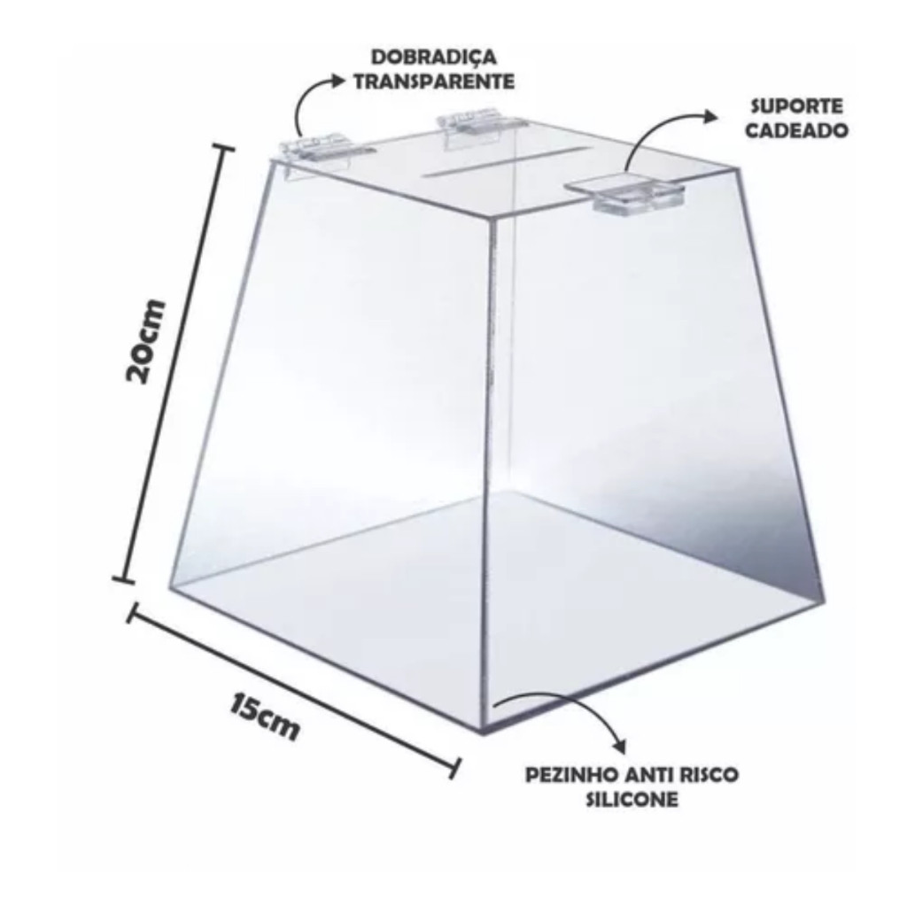 🔷 Urna Pirâmide Transparente – Altura 20 cm | Segurança para Promoções e Sorteios 🔒 Nossa urna modelo pirâmide é ideal para quem busca praticidade em promoções que utilizam cupons ou sorteios. Possui abertura na parte superior para inserir cédulas e dobradiças para uso de cadeado com chave, garantindo a segurança do conteúdo. ✨ Características: Duas dobradiças de acrílico transparente Cadeado não incluso 📏 Dimensões: Altura: 20 cm Base: 15 x 15 cm Tampa: 10 cm Rasgo da tampa: 8 cm x 0,8 cm Peso aproximado: 0,3 Kg 🧽 Conservação: Para melhor conservação, limpe apenas com pano úmido e macio. Evite álcool puro ou solventes para preservar a qualidade do acrílico.