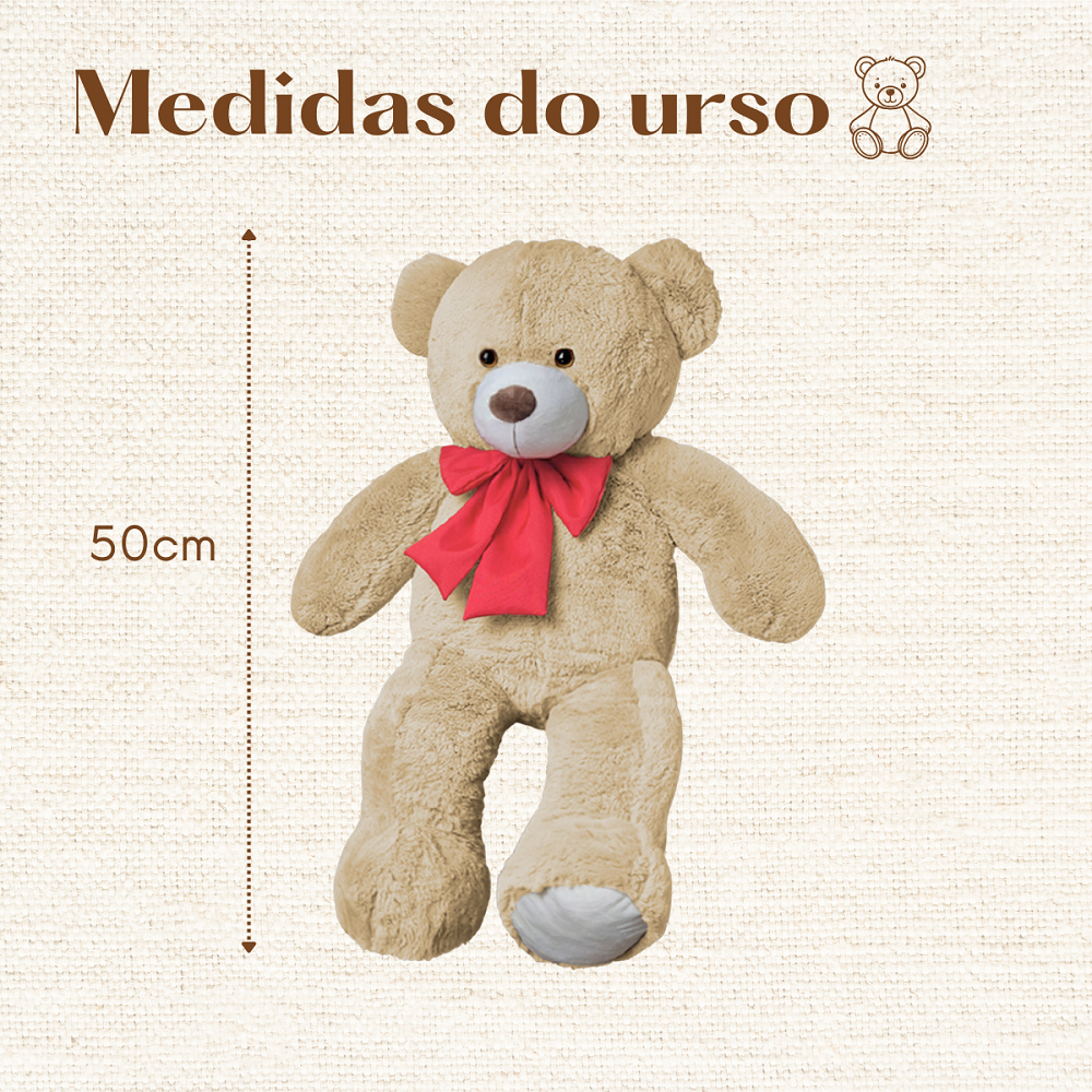 "Conheça nosso ursinho de pelúcia, com 50cm de comprimento total em pé. Ele é feito de pelúcia macia e fofa com pelinho alto, perfeito para dormir abraçado ou decorar. É um ótimo presente para aquela pessoa especial. Ele vem com um laço removível no pescoço. O enchimento é feito de fibra de silicone, garantindo que é 100% antialérgico. Este urso de pelúcia gigante também está disponível em um tamanho maior, com 100cm. Entre em contato conosco para mais informações e para fazer sua encomenda. *ESPECIFICAÇÕES TÉCNICAS: * Material: Pelúcia Baby Soft * Enchimento: Fibras de Silicone; * Medidas: 50x27cm. *COMPOSIÇÃO: * Enchimento: Fibras de Silicone 100% Poliéster; * Tecido: Pelúcia 100% Poliéster."