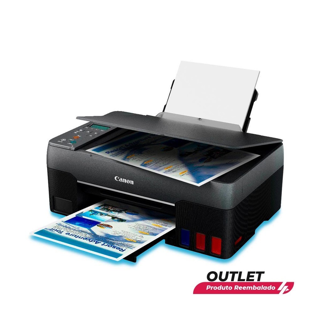 IMPORTANTE: Ao comprar este item, o Consumidor está ciente e concorda que se trata de um produto de saldo, podendo apresentar pequenas avarias, tais como, riscos e/ou amassados, reembalados/sem a caixa original, entretanto com a sua funcionalidade em perfeito estado. A garantia do produto não cobrirá as avarias acima citadas. Impressora Multifuncional Canon G2160 utiliza a tinta preta para textos mais nítidos e tinta colorida para garantir imagens com cores vibrantes. Com rendimento de 7600 páginas em preto e 7700 páginas coloridas, ou ainda 2200 fotos coloridas, a Impressora Canon G2160 é ideal tanto para escritórios quanto para casa. Capaz de realizar impressão de fotos e documentos sem borda, a Impressora Multifuncional da Canon conta ainda com sistema de abastecimento de tinta com tubos flexíveis protegidos contra a entrada de ar, evitando o ressecamento da tinta quando a impressora não está sendo usada. Importante: A Impressora Multifuncional Canon MegaTank G2160 em outlet, é um produto de devolução que retornou ao nosso estoque e foi reembalado. Essa impressora foi testada, higienizada e está em perfeito funcionamento. Por ser um produto reembalado, ele pode não estar acomodado na embalagem original e apresentar marcas, riscos ou sinais de uso. Qualquer dúvida em relação a este produto do Outlet, entre em contato conosco através da nossa central de atendimentos. Obs.: **Esse produto pode ou não acompanhar os cartuchos. Especificações Técnicas: - Velocidade Impressão :4” x 6” (10 x 15cm) Foto colorida sem bordas: Aprox. 45 segundos ESAT (Preto): Aprox. 10.8 ipm ESAT (Colorida): Aprox. 6.0 ipm - Tipo de Cartucho: GI-11 Garrafa de tinta Pigmento Preta (135 ml) GI-11 Garrafa de tinta Ciano (70 ml) GI-11 Garrafa de tinta Magenta (70 ml) GI-11 Garrafa de tinta Amarela (70 ml) - Resolução da Impressão: até 4800 x 1200 dpi - Resolução do Scanner: 600 x 1200 dpi (ótico) - Velocidade Cópia: FCOT Aprox. 23 Seg. (Colorida) - Características: Impressão sem bordas, Tanque de Tinta - Tamanho do Papel: A4, A5, A6, B5, Carta, Ofício, 4” x 6”, 5” x 7”, 7” x 10”, 8” x 10”, Envelopes (DL, COM10), Quadrado (89 mm x 89 mm), Quadrado (127 mm x 127 mm), Cartão (91 mm x 55 mm), Banner (up to 1,200 mm x 216 mm), Personalizado (width 55 mm - 216 mm, largo 89 mm - 1200 mm) - Capacidade da bandeja de papel (papel comum) 100 folhas de papel comum ou 20 folhas para fotos 10x15 cm Garantia: 3 meses