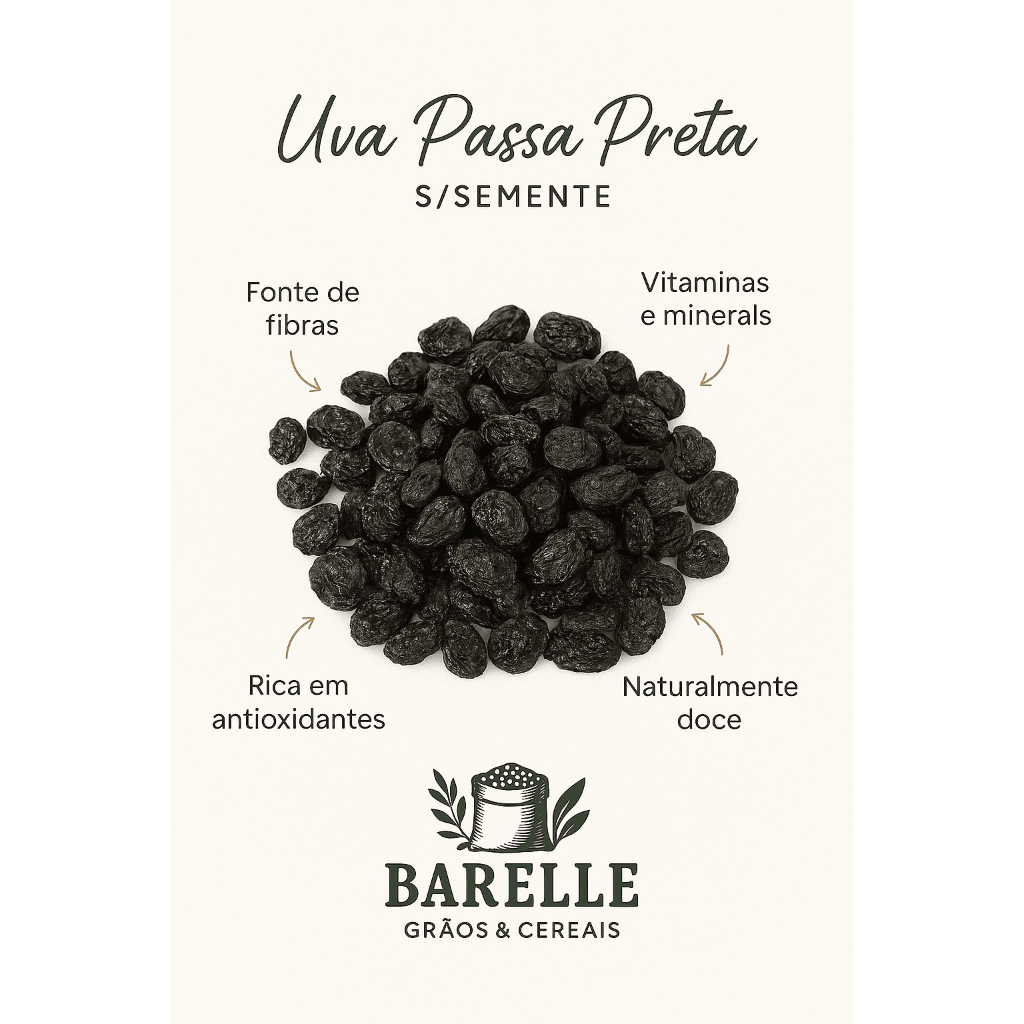 Barelle – A essência da pureza em cada detalhe Grãos e temperos cuidadosamente selecionados para quem valoriza autenticidade, qualidade e sofisticação à mesa. Entre em contato e descubra como a Barelle pode transformar seus sabores em experiências únicas. Todos os nossos produtos estão disponíveis para pronta entrega. UVA PASSA PRETA PRETA SEM SEMENTE 250g A uva passa é uma uva seca que foi desidratada e que possui um sabor doce, devido ao seu alto conteúdo em frutose e glucose. Estas uvas podem ser consumidas cruas ou em diversos pratos e podem variar de coloração. Mesmo passando pelo processo de desidratação, a uva passa não perde os seus principais componentes nutricionais. Podemos incluir no arroz, saladas, tortas, bolos, panetones, iogurtes, granola caseira, biscoitos, pães, mix de castanhas ou comer pura, inúmeros beneficios. As passas são uvas que sofrem um processo de secagem, e apresenta fenólicos na casca, polpa e sementes o que se traduz num aumento da atividade antioxidante. A passa é uma fonte de carboidrato e contém grandes quantidades de ferro, vitaminas A, B1, B2, B3, B6 e minerais. APLICAÇÃO: A uva passa é geralmente incluída nos cereais de pequeno-almoço, panificação, lacticínios e produtos de confeitaria. COMPOSIÇÃO: Uva passa preta, Óleo de Girassol. NÃO CONTÉM GLÚTEN
