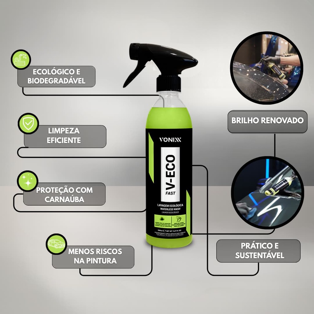 V-ECO FAST LAVAGEM ECOLÓGICA DE VEÍCULOS DESCRIÇÃO: V-ECO FAST é um produto para lavagem ecológica de veículos, biodegradável e ecologicamente correto. Contém em sua composição tensoativos, solventes ecológicos e cera de carnaúba que atuam juntos para uma limpeza mais eficaz e com menor chance de riscos na pintura. V-ECO promove brilho e leve proteção. pH Neutro DILUIÇÃO Pronto uso. USO RECOMENDADO Pintura, motor, vidros, faróis, pneus e plásticos. INFORMAÇÕES ADICIONAIS Não aplicar em superfícies de couro; Não usar sob o sol ou em superfícies aquecidas. CONTÉM CERA DE CARNAÚBA LIMPA SEM AGREDIR MODO DE USAR: Pulverizar em área não superior à 60cm x 60cm Remover a sujeira com toalha ou pano de microfibra, realizando movimentos laterais Reaplique o produto na mesma superfície em quantidade menor e realize o acabamento final, com auxílio de microfibra limpa e seca até obter o resultado desejado. Observação: Em caso de manchas, repetir a operação.