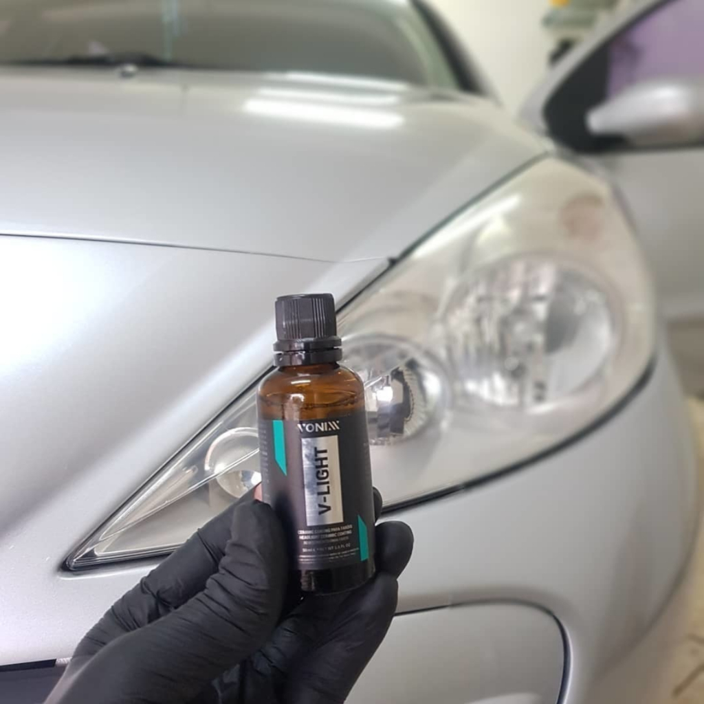 V-LIGHT PRO 50ML - CERAMIC COATING PARA FARÓIS DESCRIÇÃO: V-Light é um coating de alta performance à base de dióxido de silício, desenvolvido especialmente para recuperar faróis compostos por policarbonato e que sofreram oxidação com o passar do tempo. O produto forma um filme vítreo, semiflexível, de alta transparência e resistência, que suporta dilatações que os faróis de policarbonato sofrem com a variação da temperatura, sem correr risco de trincar ou amarelar novamente com o tempo. DURABILIDADE: Até 1 ano de proteção nos faróis e lanternas TEMPO DE CURA: Parcial: 6 horas Total: 72 horas MODO DE USO: FARÓIS OXIDADOS: 1. Realizar o lixamento dos faróis 2. Descontaminar com Barra Descontaminante e V-Lub e em seguida limpar com Revelax 3. Aplicar uma quantidade generosa de produto em movimentos horizontais usando o aplicador e a microfibra de suede de maneira uniforme 4. Certificar-se do preenchimento de toda a superfície, observando a uniformidade e transparência PROTEÇÃO PARA FARÓIS NOVOS: 1. Descontaminar com Barra Descontaminante e V-Lub em seguida limpar com Revelax 2. Aplicar o produto em pouca quantidade de produto em movimentos horizontais usando o aplicador e a microfibra de suede de maneira uniforme 3. Certificar-se do preenchimento de toda a superfície 4. Realizar acabamento com uma microfibra limpa e seca