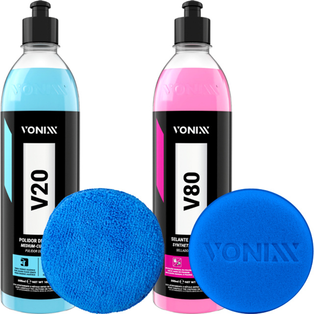 KIT CONTÉM: V20 500ML V80 500ML APLICADOR DE ESPUMA VONIXX APLICADOR DE MICROFIBRA ----------------------------------------------------------------- V20 500ML - POLIDOR DE REFINO PARA VERNIZ ASIÁTICO DESCRIÇÃO: O Polidor V20 linha asiática possui uma fórmula exclusiva para pinturas de verniz macio. Ele foi especialmente desenvolvido para etapa de refino durante o polimento automotivo, com finalidade de remover marcas de lixa P.2000 a P.2500 grit ou arranhões de mesma grandeza, marcas provenientes da etapa corte e microrriscos, apresentando um excelente acabamento e brilho. MODO DE USO: 1. Agitar bem antes de usar 2. Limpar bem a superfície a ser trabalhada 3. Utilizar politriz com velocidade entre 800 a 1600 RPM ou roto-orbital e uma boina de espuma média 4. Aplicar o produto na peça em quantidade suficiente para trabalhar em área de 50cm x 50cm 5. Ligar a politriz e realizar o polimento, exercendo pressão moderada até observar o brilho desejado 6. Se necessário, repetir a operação. Se for preciso, remover o excesso do produto com auxílio de toalha de Microfibra ----------------------------------------------------------------- V80 500ML SELANTE SINTÉTICO DESCRIÇÃO: O V80 é um selante sintético desenvolvido para proporcionar alta proteção e poder hidrofóbico à pintura do veículo. Sua fórmula exclusiva auxilia na eliminação de pequenas imperfeições e promove o brilho molhado e profundo na pintura DURABILIDADE: Até cinco meses de proteção na pintura MODO DE USO: 1. Agitar bem o produto antes de usar 2. Aplicar pequena quantidade do produto usando aplicador de espuma, realizando movimentos circulares e uniformes 3. Aguardar secar por no mínimo 15 minutos para que o produto atinja o ponto de cura 4. Remover o produto utilizando toalha de microfibra limpa e seca até obter um brilho impecável