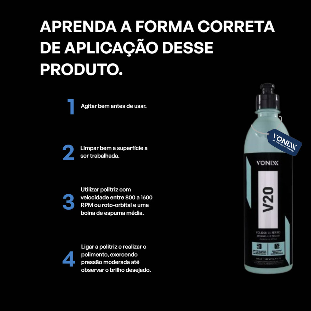 V20 é um polidor de refino que remove marcas ocasionadas na etapa de corte. Sua fórmula especial é ideal para vernizes asiáticos ou extra macios. Promove excelente acabamento na peça polida.MODO DE USO:- Agite bem antes de usar- Limpe bem a superfície a ser trabalhada- Utilizar politriz com velocidade entre 800 a 1600 RPM ou Roto-orbital e boina de espuma média- Aplicar o produto na peça em quantidade suficiente para trabalhar em área de 50x50cm- Ligar a politriz e realizar o polimento, exercendo pressão moderada até observar o brilho desejado- Se necessário, repita a operação- Se for preciso remover o excesso com uma toalha de microfibra