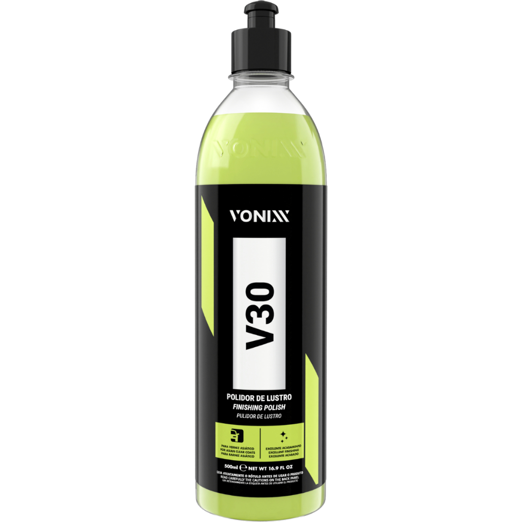 V30 500ML - POLIDOR DE LUSTRO PARA VERNIZ ASIÁTICO DESCRIÇÃO: O Polidor V30 é um composto lustrador da linha asiática, projetado especialmente para pinturas de verniz macio. Seu uso é indicado para remoção de hologramas e marcas superficiais na etapa de lustro, proporcionando brilho intenso e profundo. MODO DE USO: 1. Agitar bem antes de usar. Certificar-se de que a superfície esteja limpa e fria 2. Aplicar pequena quantidade do produto sobre a boina e com o equipamento desligado, espalhar o produto na área a ser trabalhada, a fim de evitar respingos 3. Utilizar politriz com boina adequada, em velocidade entre 800 a 1.200 rpm para rotativa ou 2.000 a 4.000 opm para roto-orbital 4. Iniciar o polimento em área de aproximadamente 70x70cm, exercendo leve pressão 5. Observar o brilho desejado. Se for preciso, remover o excesso do produto com auxílio de toalha de microfibra