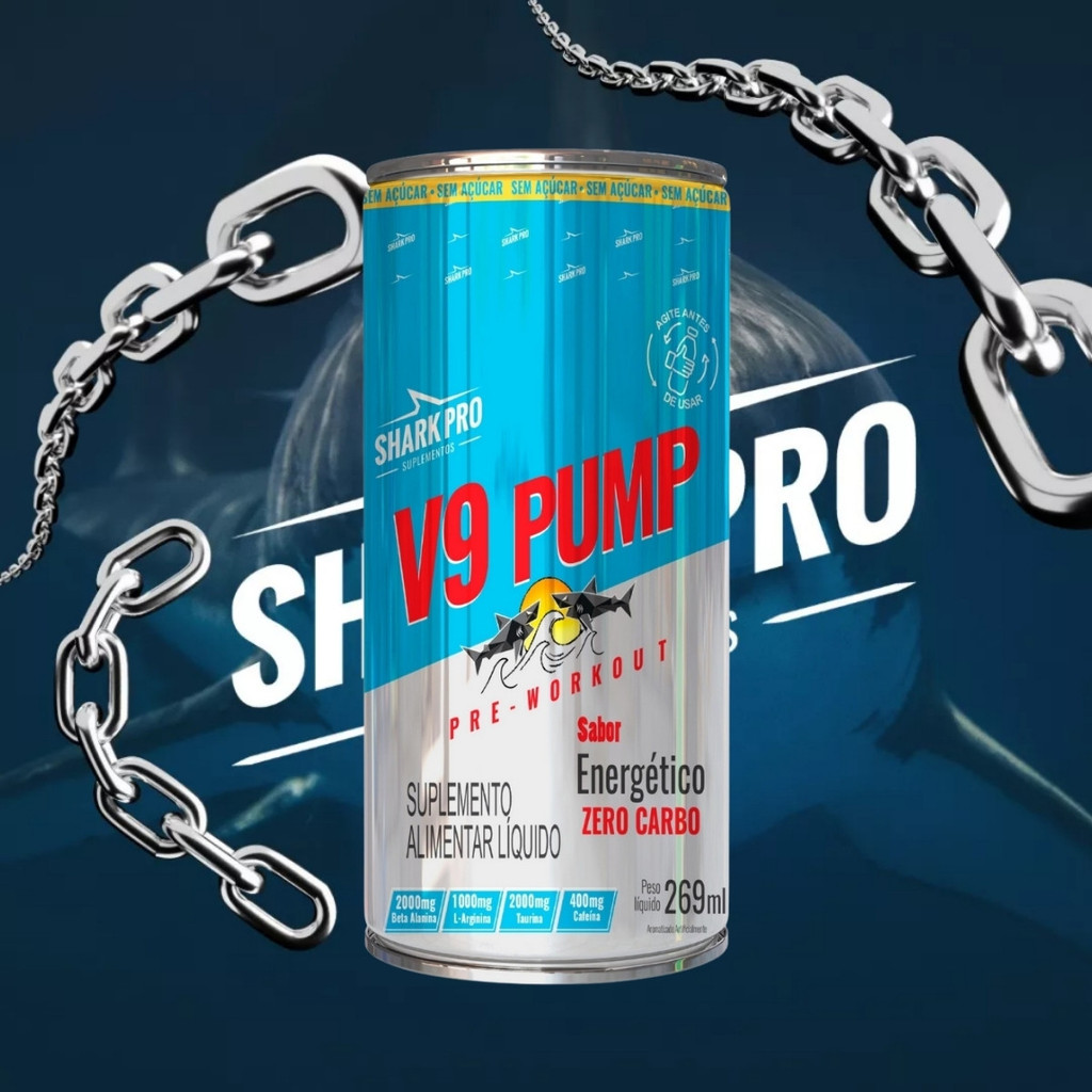 Pré-Treino V9 Pump Drink 269ml Shark Pro – Sabor Energético Sobre o produto: O suplemento principal do V9 Pump é a beta-alanina, que atua como precursor da carnosina, ajudando a reduzir a fadiga muscular durante os treinos intensos. O V9 Pump é um pré-treino líquido pronto para o consumo, ideal para quem busca praticidade e desempenho máximo nos treinos. Com uma combinação estratégica de ingredientes como L-arginina, taurina e cafeína, ele foi desenvolvido para aumentar o foco, a disposição e o rendimento físico. Seu sabor Energético oferece uma experiência agradável e refrescante, enquanto sua fórmula líquida promove rápida absorção. Como consumir: Agite antes de usar. Consumir 1 unidade (269ml) cerca de 30 minutos antes do treino ou conforme recomendação de nutricionista ou médico. Benefícios: - 2000 mg de beta-alanina por dose, contribuindo para o aumento da resistência muscular - 1000 mg de L-arginina, que auxilia na vasodilatação e melhora o fluxo sanguíneo - 2000 mg de taurina, importante para a contração muscular e função neuromuscular - 400 mg de cafeína, estimulante que promove energia, foco e disposição - Fórmula líquida de rápida absorção - Produto pronto para consumo, ideal para o dia a dia agitado Alergênicos: Não contém glúten. Pode conter traços de derivados de leite, soja e ovos, pois é produzido em local que manipula esses ingredientes. Ingredientes: Água, beta-alanina, L-arginina, taurina, cafeína anidra, acidulante ácido cítrico, aroma idêntico ao natural de cola, conservadores benzoato de sódio e sorbato de potássio, edulcorantes sucralose e acessulfame de potássio, corante caramelo IV. Advertências: Este produto não deve ser consumido por gestantes, lactantes, crianças, pessoas com sensibilidade à cafeína ou portadores de doenças pré-existentes sem orientação médica. Não exceder a dose recomendada. Mantenha fora do alcance de crianças. Conservar em local seco, fresco e ao abrigo da luz solar direta. Após aberto, consumir imediatamente. Conclusão: O V9 Pump da Shark Pro é uma excelente opção para quem busca mais energia, foco e desempenho nos treinos. Com uma fórmula potente e equilibrada, oferece praticidade e ação rápida, sendo ideal para atletas e praticantes de atividade física que desejam potencializar seus resultados.