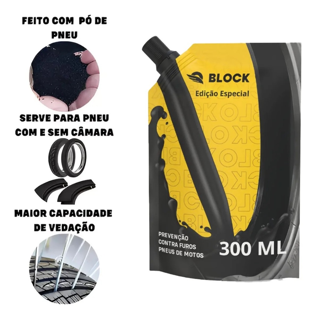 LOJA MOTOFRANCA VACINA DE PNEU MOTO BLOCK SELANTES NOVA EMBALAGEM POUCH Selante de Pneu preventivo contra furos para todos os tipos de motocicletas e scooters. Produto exclusivo para pneus de motocicletas e scooters. Não aplicar em bicicletas e outros tipos de veículos. Leia com atenção todas as informações do produto antes de efetuar a compra DESCRIÇÃO DO PRODUTO Aposto que você já teve um pneu furado! É muito chato, não é? Sem contar as consequências que podem ser, além do transtorno, atrasos, risco de acidente, risco de assalto e despesas com borracheiro. A Vacina de Pneu Moto BLOCK é um selante preventivo que veda os indesejáveis furos instantaneamente, evitando a perda de pressão. A aplicação é fácil, rápida e limpa, sem a necessidade de desmontar o pneu a roda. Escolha ter mais segurança, economia e conforto. Aplique BLOCK nos pneus de sua moto! CARACTERÍSTICAS: • Pode ser aplicado em pneus com e sem câmara de ar; • Veda furos na banda de rodagem do pneu, instantaneamente, de dentro para fora; • Dosagem única: aplicar 1 embalagem inteira em cada pneu para todas as motocicletas e scooters, independentemente do modelo, tamanho e cilindrada (nunca dividir o conteúdo da embalagem, aplicando metade em cada pneu, sob risco de perda da garantia); • A aplicação é feita pela válvula de pressão do pneu, sem a necessidade de desmontar o pneu da roda; • Ecologicamente correto: biodegradável, atóxico e não inflamável. Nova embalagem com 90% menos plástico. FICHA TÉCNICA: • Dosagem: 300ml • Veda furos causados por objetos lisos com diâmetro de: • Pneu sem câmara: até 4mm • Pneu com câmara: até 2mm • A capacidade de vedação de furos causados por objetos com formatos irregulares pode variar. • Não veda rasgos nem cortes, nem furos na lateral e ombro do pneu • Não interfere no equilíbrio dinâmico da moto nem afeta o balanceamento das rodas • Não deve ser aplicado em motos que tenham sensor de calibragem • Vida útil no pneu: pode durar por toda a vida útil do pneu em condições de uso normais CONTEÚDO DA EMBALAGEM: • 01 Vacinas de PNEU MOTO • 01 mangueiras de aplicação