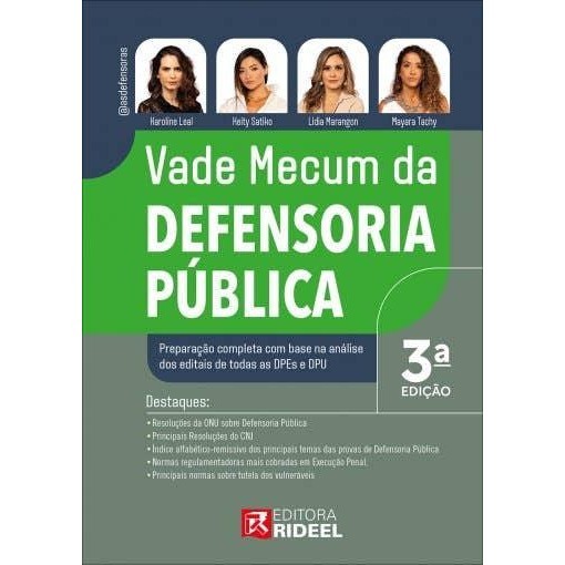 Orgs.: Karoline Leal, Keity Satiko, Lídia Marangon e Mayara Tachy Ao longo dos anos como Defensoras Públicas e professoras para os mais diversos concursos públicos do país, fomos questionadas por centenas de alunos acerca da existência de um vade mecum completo para a carreira de Defensor Público. O objetivo da obra é atender a todos que almejam a carreira de Defensor Público, bem como ser fonte de consulta diária para todas as Defensoras e Defensores Públicos do País. A obra foi elaborada e organizada a partir da seleção dos principais diplomas legislativos de cada área (estatutos, leis, decretos e resoluções específicas) exigidos nos diversos concursos da carreira de Defensor Público. Quanto à forma, este livro contempla normas específicas especialmente selecionadas, não previstas tradicionalmente em outras obras, mas exigidas com profundidade nos editais de certames da carreira de Defensor Público e no exercício da profissão. Para potencializar os seus estudos, indicamos o Vade Mecum Acadêmico de Direito RIDEEL, que contempla as mais importantes normas do ordenamento jurídico brasileiro. Assim, você tem a oportunidade de estudar de maneira completa, específica e que pode ser utilizada tanto na preparação para o concurso como na realização das etapas que admitam consulta à legislação. Nossos agradecimentos a todos os nossos alunos, alunas e familiares por todo o apoio e incentivo. Sem vocês esta obra não teria existência. Ao final, desejamos um estudo prazeroso. Esperamos sinceramente que esta obra seja sua aliada na preparação para o concurso público e que te acompanhe após sua aprovação. Boa leitura! As Defensoras. Instagram: @asdefensoras
