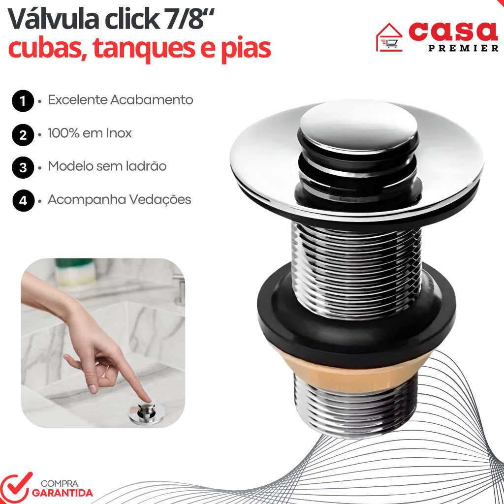 A Válvula Click 7/8 Inteligente para Escoamento de Cubas e Pias é a solução ideal para quem busca praticidade e eficiência no banheiro. Com um design moderno e funcional, este produto da marca Premier Metais se destaca pela sua construção em metal cromado, garantindo durabilidade e resistência ao uso diário. Excelente custo-benefício; INFORMAÇÕES TÉCNICAS Produto: Válvula Click 03 cm Com Fechamento Interno; Material: Metal; Acabamento: Cromado; Furação: 3 cm (30mm); Transforme seu banheiro com esta válvula inteligente, que combina funcionalidade e estética, proporcionando uma experiência de uso superior. Ideal para quem valoriza um ambiente moderno e prático, a Válvula Click é a escolha certa para o seu lar.