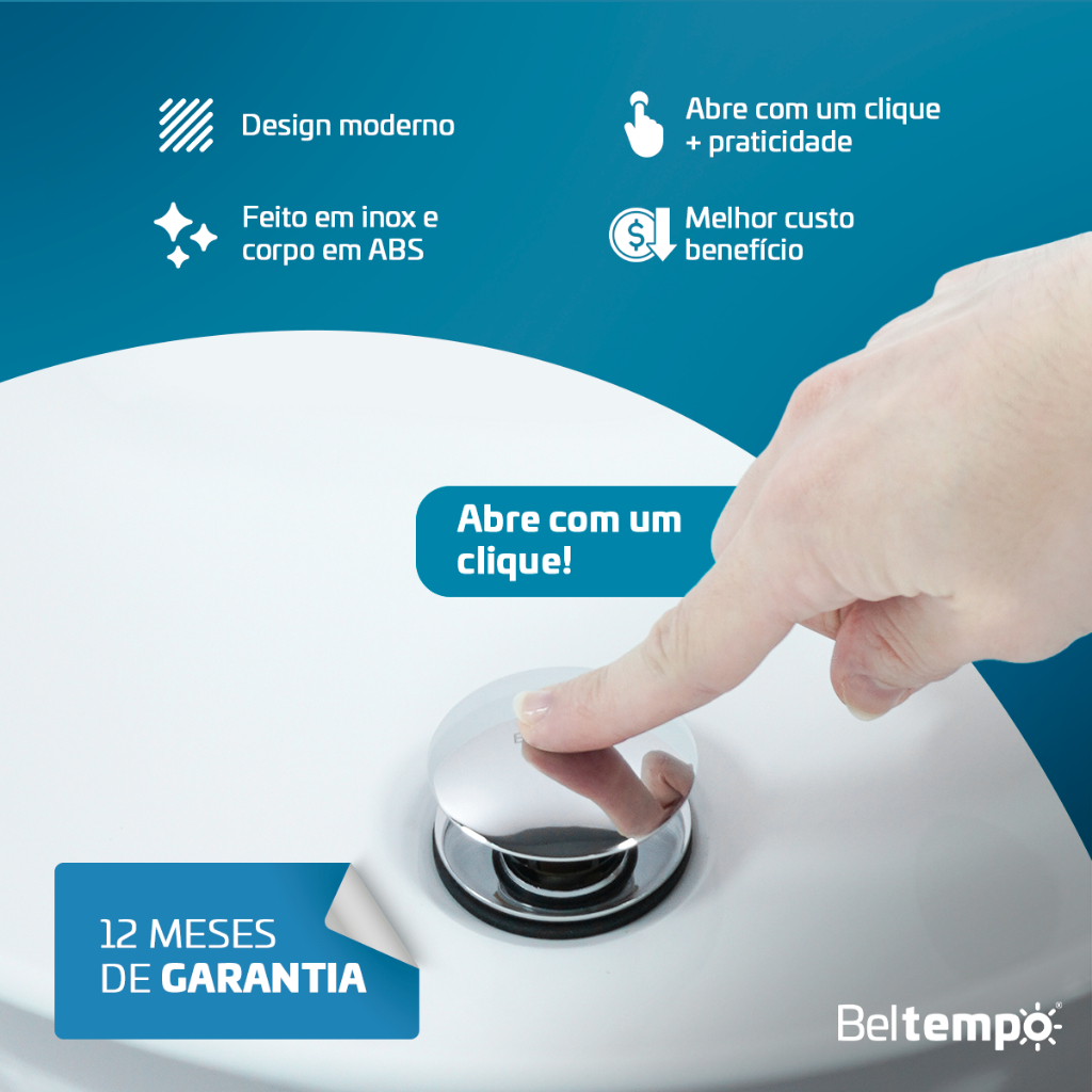 Válvula Click 7/8 Ralo Cuba Pia Banheiro Inox Beltempo A Válvula Click 7/8" da Beltempo oferece excelente custo-benefício. Feita em aço inox e corpo em ABS, garante durabilidade e praticidade com seu sistema click e tampa removível para fácil limpeza. Ideal para cubas e pias, combina design moderno e funcionalidade. Adquira um produto de excelência da Beltempo, uma marca com 30 anos de inovação, qualidade e confiança no mercado. PRINCIPAIS CARACTERÍSTICAS: - Feito em aço inox e corpo em ABS - Sistema de abertura e fechamento com um clique, proporcionando praticidade - Instalação simples e rápida - A tampa click é removível, facilitando a higienização INFORMAÇÕES TÉCNICAS: - Marca: Beltempo - Linha: Classic - Modelo: BT-9300 - Tipo: Click - Material: Aço inox + Corpo em ABS - Bitola da rosca de saída: 7/8’’ - Temperatura máxima de operação: 50 °C - Acompanha: Rosca de fixação, arruela, anel de vedação. - Uso Indicado: Para ralos de Cuba, Lavabo, Pia, Tanque, Bancada e etc. DIMENSÕES: - Altura da rosca: 7 cm - Diâmetro da tampa click: 6 cm - Diâmetro superior (encaixe na pia): 5,6 cm - Diâmetro Inferior: (rosca de saída): 3,0 cm - Furo de Instalação: 3,5 cm - Peso: 75 g DICA DE LIMPEZA: Nunca utilize palha de aço, produtos abrasivos, químicos ou solventes para a limpeza. DÚVIDAS FREQUENTES: 1. Qual o material da válvula? A válvula é feita em aço inox e seu corpo em ABS, garantindo alta durabilidade e resistência. 2. Essa válvula serve para lavatórios padrão? Sim, ela foi projetada para ser compatível com pias padrão com furação de 7/8", encaixando-se perfeitamente em lavatórios comuns. 3. É fácil de limpar? Sim, a tampa click da válvula é removível e esse é um grande diferencial que facilita a limpeza. 5. O acabamento descasca com o tempo? O acabamento é resistente a desgastes e mantém sua aparência impecável, desde que siga as orientações de limpeza adequadas.