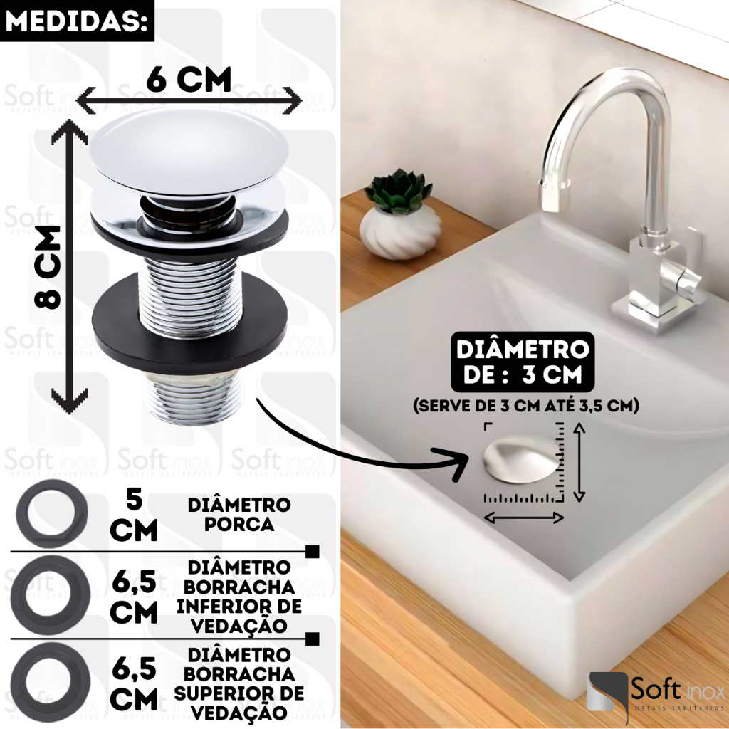 Válvula Click De Inox Ralo P/ Cuba Pia de Banheiro Lavatório 7/8 Cromada de 3cm