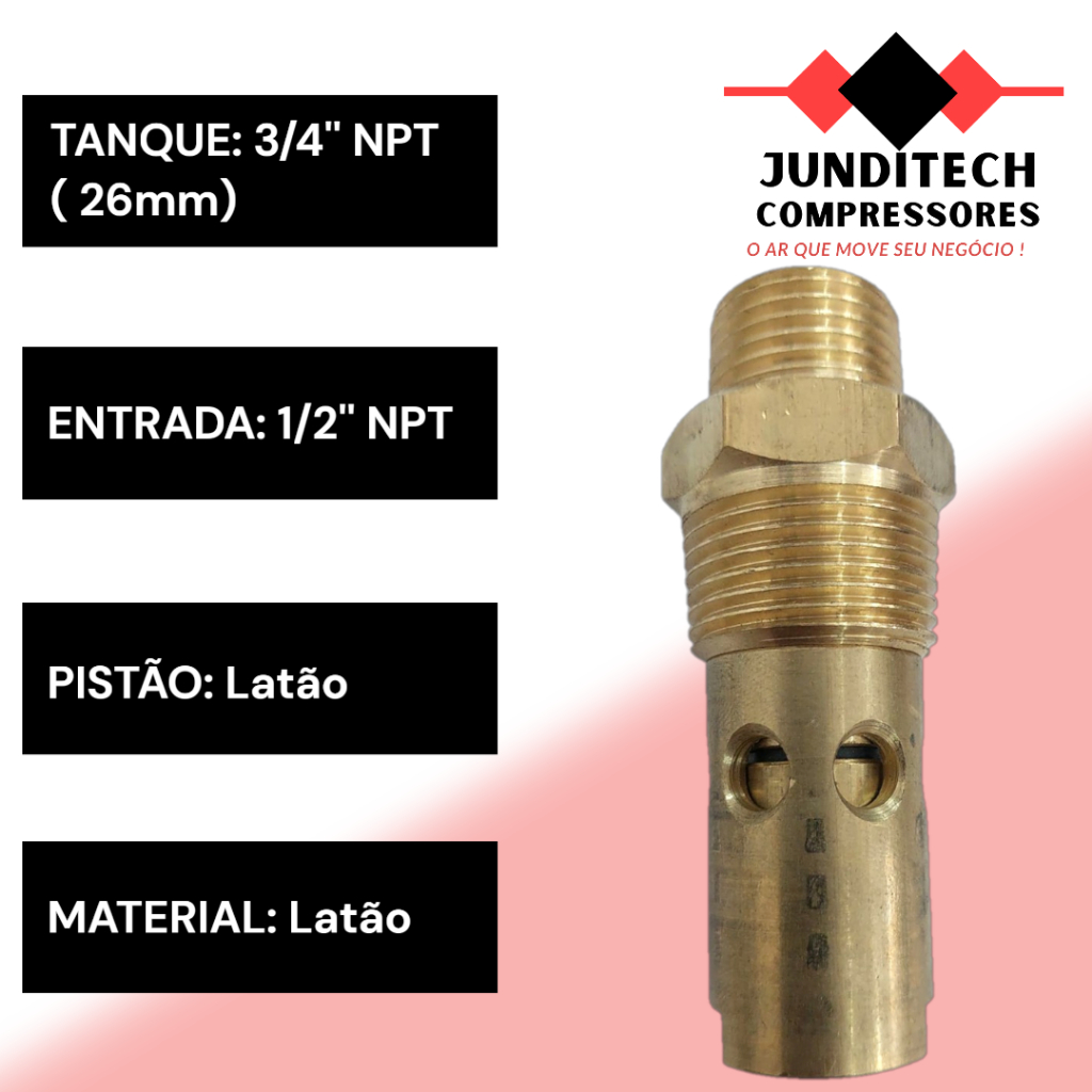 Seja bem-vindo à Loja Oficial da JUNDITECH COMPRESSORES na SHOPEE BRASIL Aqui você encontra kits de manutenção, peças e acessórios originais e compatíveis das principais marcas – Schulz, Pressure, Chiaperini, Motomil, Tekna, Vonder e Schweers – sempre com qualidade garantida, procedência e envio rápido. VÁLVULA DE RETENÇÃO 3/4'' NPT x 1/2'' NPT SEM ALÍVIO – LATÃO A válvula de retenção 3/4" x 1/2" NPT é essencial para o funcionamento correto do sistema de ar comprimido, impedindo o retorno do ar do reservatório para o cabeçote do compressor. Fabricada em latão maciço de alta qualidade, garante excelente vedação, resistência à pressão e longa vida útil. Ideal para substituição em compressores Schulz e Pressure, mantendo o desempenho original do equipamento. ESPECIFICAÇÕES TÉCNICAS Código: VR20 Material: Latão usinado Rosca para reservatório: 3/4" NPT (26 mm – rosca cônica) Rosca para entrada de ar: 1/2" NPT (20 mm) Saída lateral de alívio: Não possui Reparo interno: Corpo em latão – vedação eficiente Pressão máxima de trabalho: 175 psi (12 bar) COMPATIBILIDADE Compatível com os seguintes modelos: Schulz: MSV 10 S.A / MSV 10 VL Pressure: PSV 10 / PSV 15 (modelos antigos) E outros compressores com as mesmas dimensões de conexão. CARACTERÍSTICAS E BENEFÍCIOS Impede o retorno de ar para o cabeçote Mantém a pressão ideal no reservatório Construção robusta em latão resistente Alta durabilidade e fácil substituição DICAS DE MANUTENÇÃO BÁSICA Troque o óleo a cada 200 horas de uso ou a cada 2 meses, conforme manual do fabricante. Verifique o nível de óleo semanalmente pelo visor ou vareta. Limpe o filtro de ar semanalmente e substitua a cada 4 meses. Drene a água do reservatório pelo menos 1 vez por semana, ajustando conforme o uso. SOBRE A JUNDITECH COMPRESSORES Com mais de 10 anos de experiência, somos especialistas em: Compressores de ar a pistão Peças de reposição originais Redes de ar e ferramentas pneumáticas Oficina própria e estoque completo Autorizada das principais marcas: Schulz, Chiaperini, Pressure, Motomil e Tekna Atendemos mais de 10 mil clientes em todo o Brasil com confiança, segurança e qualidade. Garantia e procedência asseguradas. Envio imediato para todo o Brasil.