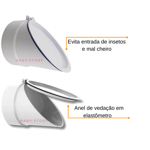 Bem Vindos a NanyStoree Envio em até 24 horas úteis VÁLVULA DE RETENÇÃO PARA TUBO DE ESGOTO NAS MEDIDAS: 40mm, 75mm ou 100mm; A Válvula de 75mm, possui tamanho de 100mm com redução interna para 75mm. A válvula de 40mm, possui tamanho de 50mm com redução interna para 40mm. ESPECIFICAÇÕES: - Medidas Disponíveis: 40mm, 75mm, 100mm - Evita mau cheiro, retorno do esgoto, isentos como baratas e roedores; - Cores disponíveis: Branca ou Preta. - Fabricada em PVC; - Anel de Vedação em EVA; - Abertura da Tampa 15º à 90º; - Fechamento Estanque 0,60 M.C.A; - Norma Brasileira (NBR) 5688 PRODUTO DE FÁCIL UTILIZAÇÃO E FÁCIL INSTALAÇÃO.