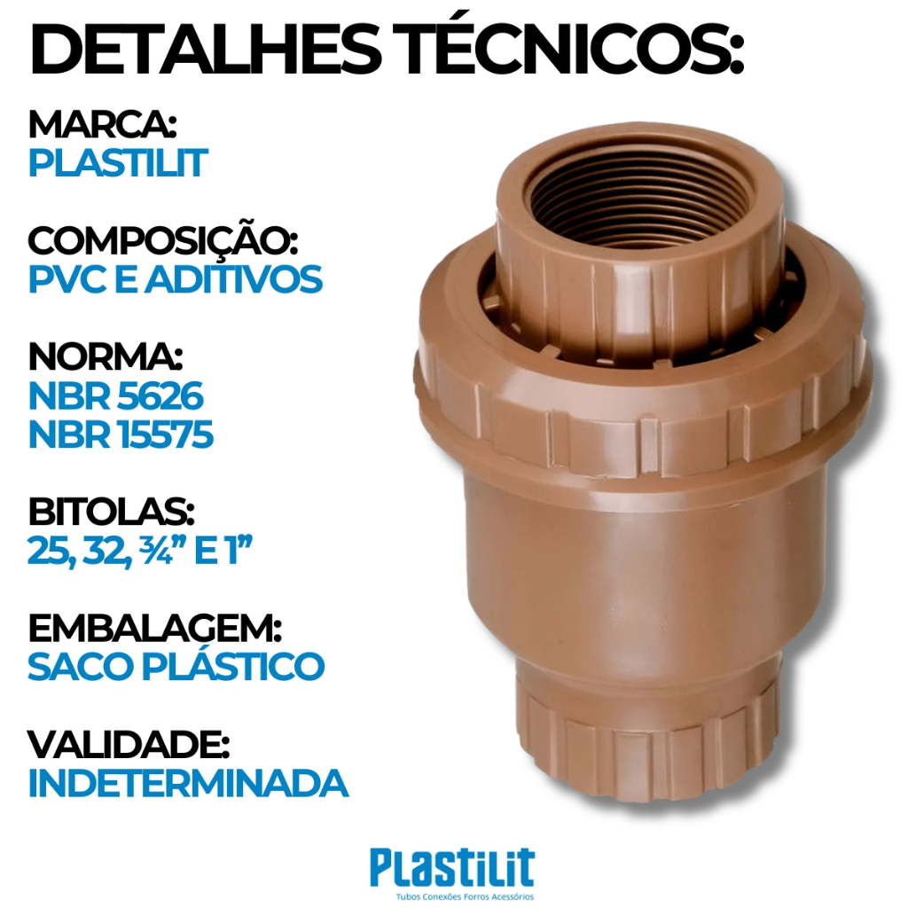 Válvula de Retenção Roscável 3/4 25mm - Plastilit Bloqueia o fluxo de água e evita que ocorra o refluxo na tubulação permite que a água escoe em uma única direção impedindo o seu retorno no sentido contrário. Características Gerais: - Marca: Plastilit - Cor: Marrom - Bitola: 3/4 25mm - Material: PVC e Aditivos - Norma de referência: NBR 5626 Acompanha: - 01 Válvula de Retenção Roscável 3/4 25mm - Plastilit ------------------------------------------------------------------------ PERGUNTAS FREQUENTES: -Possui Nota Fiscal? Sim, todos nossos produtos possuem nota fiscal. - Possui estoque? Todos os nossos produtos postados estão em estoque, a pronta entrega. - Envia para todo o Brasil? Sim, nossas entregas são feitas para todo o Brasil através do programa logístico da Shopee. Mais praticidade e segurança para sua compra. - Quanto tempo para o envio? Todas as compras são enviadas no mesmo dia. - Possui garantia? Sim, durante o tempo indicado em cada anúncio. Entre em contato conosco pelo campo de mensagens da Shopee caso tenha qualquer problema e resolveremos para você. - Posso retirar o produto? Somente enviamos através da Shopee. Estamos a disposição para qualquer outra dúvida. Mande-nos no chat, responderemos rapidinho! Boas compras! Atenciosamente, Equipe Lojas Coisarada!