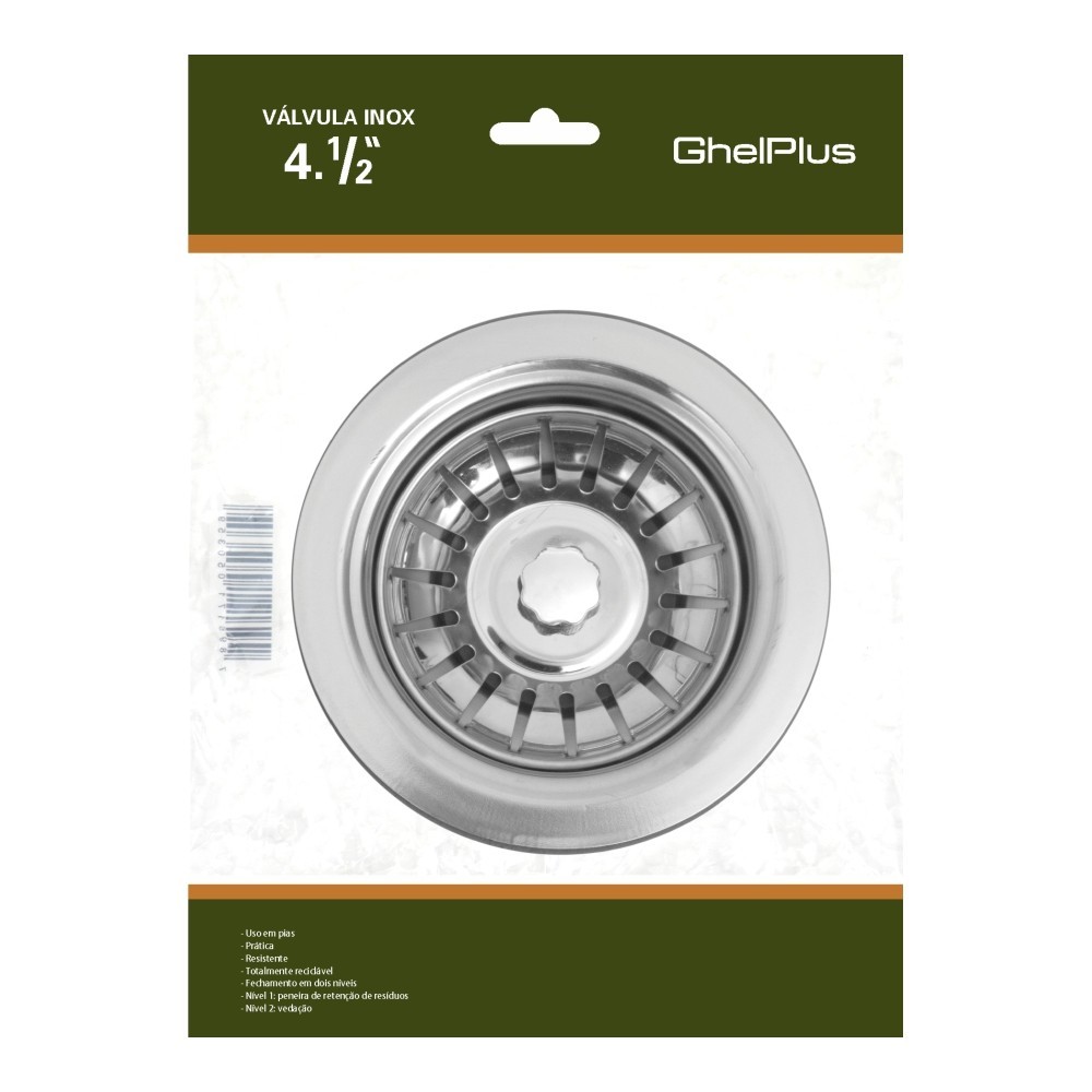 VALVULA P/ PIA DE COZINHA INOX - 4.1/2 - PINO CROMADO ABS VALVULA AMERICANA 10.03.05035 O modelo de válvula de 4. 1/2 polegadas, além de realçar a beleza da sua cozinha, proporciona também uma maior vazão da água. Ainda conta com sistema de fechamento em dois estágios: no primeiro o escoamento da água e retenção de resíduos, no segundo ocorre a vedação total. Base superior é de aço inoxidável e o pino de abertura em ABS cromado. DIFERENCIAIS DO PRODUTO - Fechamento em dois estágios: - Primeiro escoa a água e retém detritos; - Segundo, vedação total; - Base superior em aço inoxidável; - Pegador com pino em ABS cromado.