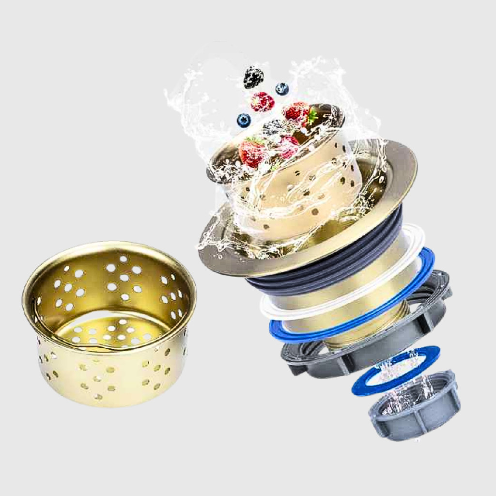 Válvula Ecológica Cor Dourada 4.1/2'' Ralo Com Cesto Para Pia Cozinha Esta válvula evita que resíduos de alimentos entrem na rede de esgoto, prevenindo entupimento da mesma e facilitando o reaproveitamento do lixo orgânico para a compostagem ou reutilização em hortas. Válvula Inox Ecológica 4.1/2'' Com Cesto Para Pia de Cozinha - Material: Aço inox 304 - Acabamento: Escovado - Medida da furação na cuba de 9 cm - Cesto inox removível - Fácil instalação