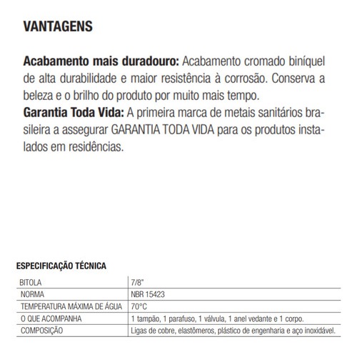 Ficou alguma dúvida? Faça sua pergunta, ficaremos satisfeitos em lhe atender bem. Emitimos Nota Fiscal. Qualidade, preço Justo e atendimento Perfeito. Válvula Lavatório Docol Universal Arte 00486372 Ouro Escovado: A válvula de saída d'água é perfeita para quem busca qualidade e resistência em cada detalhe. Com o acabamento universal, o produto possui a confiança da nossa Garantia Toda Vida para durar por muito mais tempo. Seu design foi pensado para garantir o total escoamento d'água, além da perfeita vedação. O encaixe é universal e funciona nos mais variados estilos de cubas. A escolha por complementar seu ambiente com os nossos itens garantirá o melhor funcionamento dos produtos e a nossa qualidade até nos pequenos detalhes da sua casa. Características do produto: - Marca: Docol; - Bitola: 7/8''; - Linha: Arte; - Cor: Ouro Escovado; - Material: Metal; - Referência: 00486372; - Composição: Ligas de cobre, elastômeros, plástico de engenharia e aço inoxidável; - Garantia: Garantia Toda Vida Docol. Dimensões do produto: - Altura: 95mm; - Largura: 64mm; - Profundidade: 64mm. Ficou alguma dúvida? Faça sua pergunta, ficaremos satisfeitos em lhe atender bem. Emitimos Nota Fiscal. Qualidade, preço Justo e atendimento Perfeito.