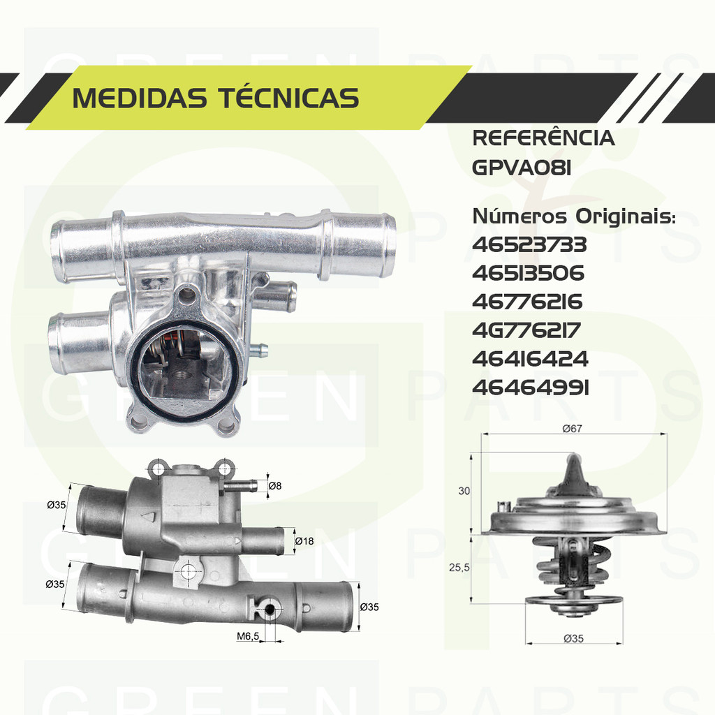 Aplicações: FIAT BRAVA 1.6 16V 1996 A 2000 FIAT PALIO 1.6 16V 1996 A 2000 FIAT SIENA 1.6 16V 1998 A 2001 FIAT STRADA 1.6 16V 1999 A 2001 Observações: PARA VEÍCULOS COM AR-CONDICIONADO Especificações: Tipo: Válvula termostática Temperatura de abertura: 88 °C Referência: GPVA081 Marca: Greenparts EAN: 7908374434281 Números Originais: 46523733 46513506 46776216 4G776217 46416424 46464991 46464992 46467873