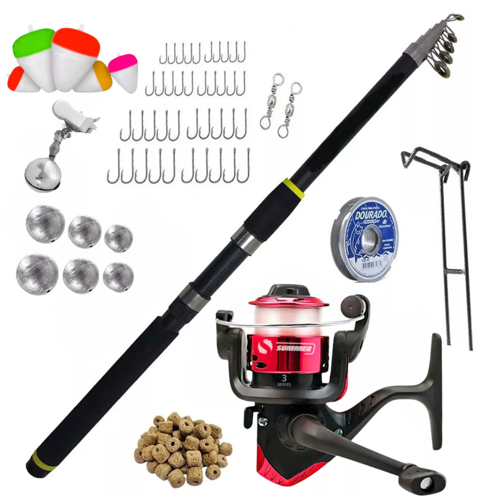 Kit pode ser utilizado em rios, pesqueiros, lagos e represa, indicado para pesca de tilápia, piau, carpa, pacú, traíras, tucunaré, robalo entre outros peixes 01 Molinete com Sistema Balanceado 1 Rolamento Summer ESPECIFICAÇÕES Marca: Summer Modelo: SM 1000 Rolamentos: 1 Recolhimento: 5.5:1 Capacidade de Linha: 0.20mm - 200m Peso: 160g OUTRAS CARACTERISTICAS Carretel Cromado em grafite Sistema: Balanceado Manivela: Bilateral Dobrável 01 Vara Telescópica com Passadores 3,60 Metros Suporta 4 kilos 01 Linhas Monofilamento 0,25mm 100m 01 Suporte para vara de aço Anzol 4330 Super Strong Marine Sports Niquelado Nickel,facilita fixar a isca e também ao fisgar do peixe a ser pescado, pois possui farpas muito eficiente que facilitam a pesca 10 Anzol 4330 Nº1 (3,1 cm) 10 Anzol 4330 Nº6 (2,0 cm) 10 Anzol 4330 Nº8 (1,8cm) 10 Anzol 4330 Nº10 (1,5 cm) Chumbo Bolinha, utilizado em pesca de fundo, fazendo com que a isca permaneça no fundo da água 2 Chumbo de 2gr 2 Chumbo de 4gr 2 Chumbo de 8gr 2 Chumbo de 10gr Boia em isopor colorida, utilizada para controlar a profundidade da isca em rios e pesqueiros, possui um bastão de plastico para a passagem da linha 2 Boia nº4 2 Boia nº5 2 Boia nº6 2 Giradores simples em aço carbono nº7, super resistente. Utilizado para evitar torção da linha. 2 Sinete/Alarme de Espera utilizado em varas para que possa deixar na espera aguardando o peixe puxar, ao fisgá-lo o sinete lhe informa e você consegue visualizar qual a vara 1 Pacote Isca especial para pesca furadinha