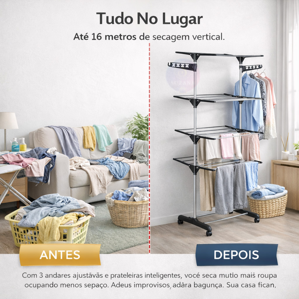 Conheça o Vittorio AirRack™ – o sistema vertical inteligente que transforma qualquer ambiente em uma lavanderia organizada, funcional e eficiente. Chega de conviver com roupas espalhadas pela casa, improvisos desconfortáveis e varais frágeis que quebram na hora da necessidade. O Vittorio AirRack™ é a solução definitiva para quem busca controle total, praticidade e uma organização impecável mesmo em espaços reduzidos. Com capacidade para até 48 kg e 16 metros lineares de secagem, este sistema vertical oferece espaço suficiente para lidar com grandes volumes de roupa sem ocupar áreas preciosas da casa. Sua estrutura em aço reforçado, varas em aço inox e acabamento premium garantem resistência e durabilidade, enquanto os rodízios com trava possibilitam mobilidade perfeita, mesmo carregado. Esqueça os varais tradicionais que só ocupam espaço e causam frustração. O Vittorio AirRack™ entrega liberdade para posicionar e guardar com facilidade, ao passo que melhora a estética do seu lar, aumentando sua autoestima por ter uma casa sempre em ordem e limpa visualmente. Medidas: - Altura: 164 cm - Comprimento: 118 cm - Largura: 55 cm Materiais: - Estrutura em aço reforçado - Varas em aço inox - Rodízios com trava - Acabamento premium Por que escolher o Vittorio AirRack™? - Organização imediata eliminando o caos visual - Economia de espaço e dinheiro substituindo vários varais - Durabilidade superior que elimina quebras inesperadas - Fácil mobilidade para uso em diferentes cômodos - Design que valoriza e harmoniza qualquer ambiente 🚨 ATENÇÃO: últimas unidades disponíveis do lote atual. Estoque limitado devido à alta demanda. Garanta agora seu Vittorio AirRack™ antes do próximo reajuste de preço e revolucione sua rotina de cuidados com as roupas.