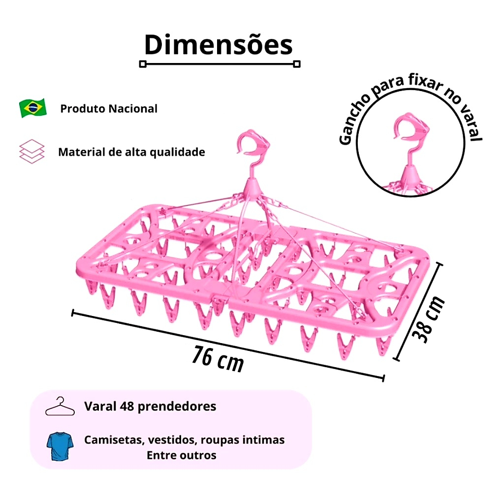 🌟 Transforme seu cotidiano com o Varal Multiuso Lig Brin! 🌟 Cansado de bagunça e roupas íntimas espalhadas pela casa? Deseja praticidade e organização em seu lar? Então, o Varal Multiuso Lig Brin é a resposta para os seus problemas! ✨ Versatilidade incomparável: Com 48 prendedores de alta qualidade, você terá espaço de sobra para pendurar suas peças com segurança, evitando qualquer dano. 👕 Cuide das peças delicadas: Ideal para pendurar suas roupas íntimas, meias e até mesmo aquelas peças mais delicadas que exigem cuidado especial. 👌 Prático e dobrável: Sua estrutura dobrável facilita na hora de guardar, ocupando mínimo espaço e mantendo sua casa sempre organizada. 💪 Durabilidade garantida: Não se preocupe com a quebra dos prendedores. Utilizamos materiais de alta qualidade que garantem a resistência necessária para suportar o uso diário sem comprometer sua eficiência. **Ficha Técnica: Varal Multiuso Lig Brin** **Dimensões**: (A x L x C) - Fechado: 7 x 38 x 38 cm - Aberto: 30 x 38 x 76 cm - Material: Estrutura em Plástico Polipropileno resistente e durável. - Prendedores: 48 prendedores de qualidade, proporcionando ampla capacidade de pendurar roupas íntimas, meias e peças delicadas. - Dobrável: Design dobrável para facilitar o armazenamento quando não estiver em uso, ocupando mínimo espaço. - Versatilidade: Ideal para uso em áreas internas e externas, oferecendo praticidade e organização no dia a dia. - Garantia: Garantia de durabilidade e resistência para o uso diário. - Marca: Lig Brin - Conteúdo da Embalagem: 01 Varal Multiuso Lig Brin com 48 prendedores. --------ATENÇÃO: Envio em cores Sortidas: Podendo ser Rosa, Tiffany (Verde), Branco.--------