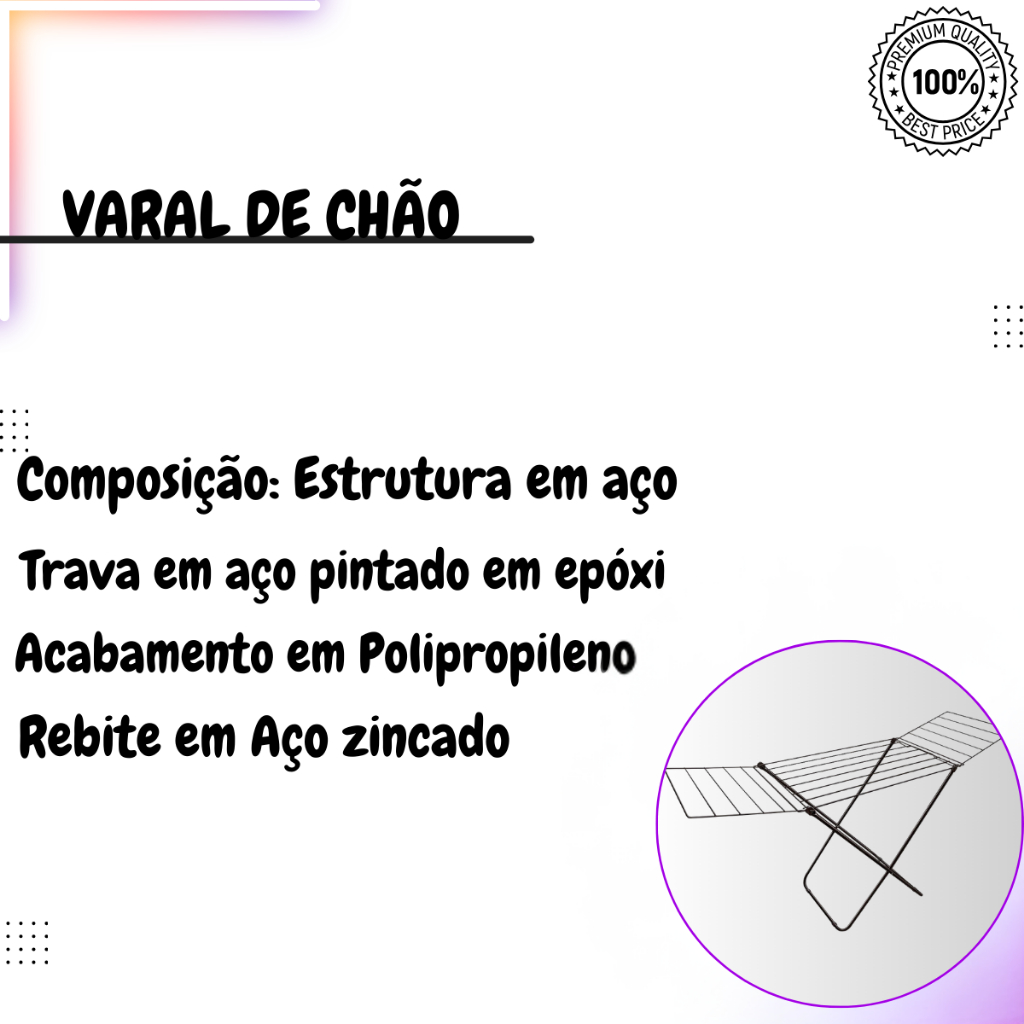 VARAL DE CHÃO NÁPOLES PRODUTO ORIGINAL COM NOTA FISCAL Este varal é o produto perfeito para você que quer otimizar os espaços da sua lavanderia.- Todo produzido em aço reforçado com varetas rebitadas e transpassadas, isso permite que não desmontem e nem que as varetas fiquem frouxas com o tempo.- O varal é ideal para lugares pequenos, para quem mora em apartamento e quer estender as roupas em sua varanda, sacada, ou até mesmo dentro de casa. Características do Produto Capacidade de roupas úmidas: 11 kg Equivale: 10,20 m Cor da estrutura: Branco Cor do acabamento: Preto Portátil: Sim Dobrável: Sim Aba: Sim Varetas do quadro: 8 Varetas da aba: 2 abas com 5 varetas cadaContém:1 unidade de varal de chão modelo NÁPOLES COM ABAS – AÇO.A praticidade que você precisa em apenas um click. Composição do Produto Estrutura do produto: Aço Acabamento: Polipropileno Rebites: Aço zincado