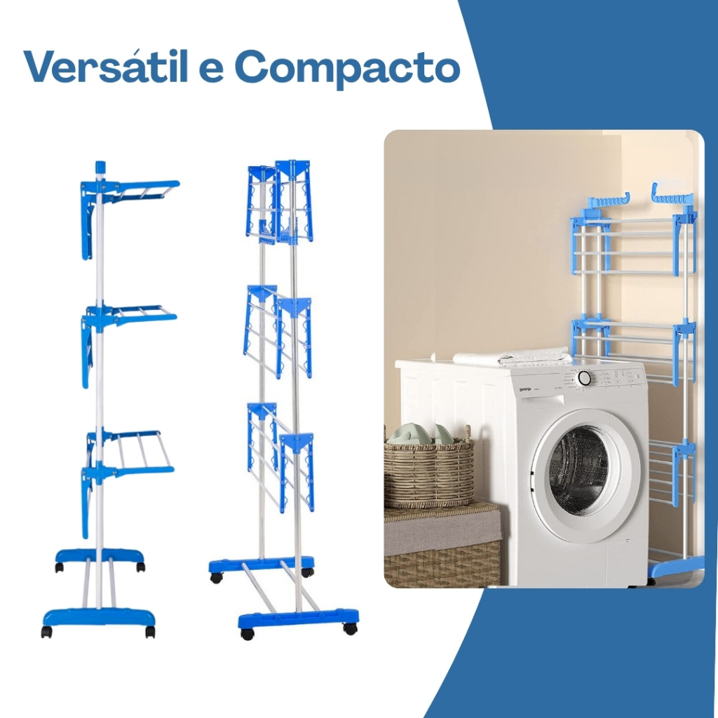 Varal de Chão Dobrável com Rodinhas – 3 Andares Reforçados e Retráteis Ganhe praticidade e eficiência na secagem de roupas com o Varal de Chão Dobrável 3 Andares com Rodinhas. Ideal para quem tem pouco espaço e precisa de um produto versátil, resistente e funcional. Principais Benefícios: - 3 Andares com Design Vertical: Otimize seu espaço com grande capacidade de secagem sem ocupar muita área no chão. - Prateleiras Reforçadas e Retráteis: Flexíveis e resistentes, ajustam-se conforme o tipo e tamanho das roupas. - Dobrável e Compacto: Após o uso, basta dobrar e guardar – perfeito para apartamentos e áreas pequenas. - Rodinhas Giratórias 360°: Mobilidade total para levar o varal a qualquer ambiente da casa com facilidade. - Alta Capacidade de Suporte: Suporta até 30 kg de roupas – ideal para famílias ou grandes volumes. - Versátil para Uso Interno e Externo: Use dentro de casa em dias chuvosos ou ao ar livre nos dias de sol. - Fácil Montagem: Não precisa de ferramentas. Montagem rápida e prática. - Estável e Durável: Estrutura reforçada feita com materiais de alta qualidade, garantindo longa vida útil. Especificações Técnicas: Altura: 165 cm Largura: 55 cm Comprimento: 120 cm Capacidade de carga: até 30 kg (10Kg por prateleira)